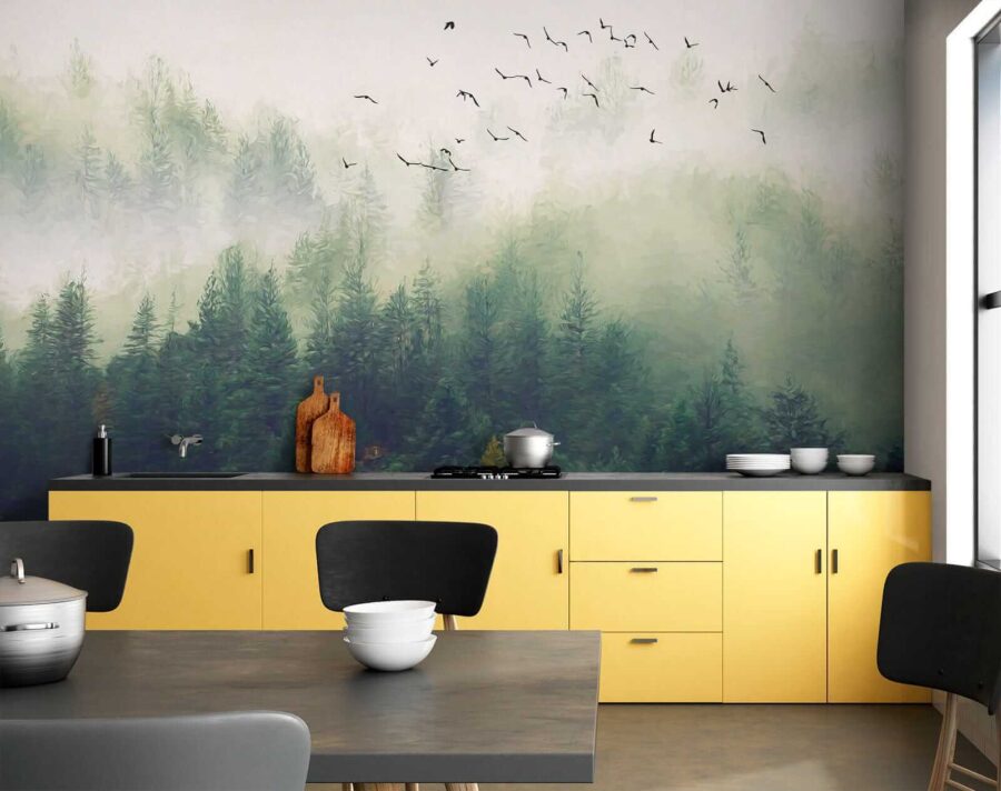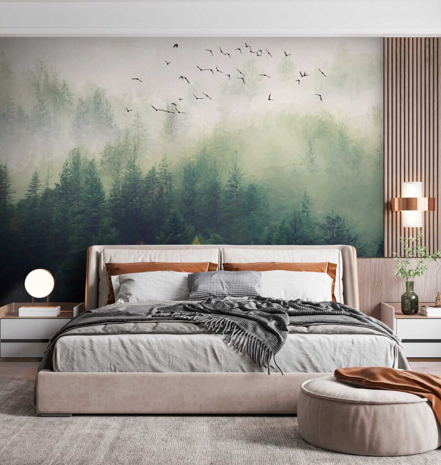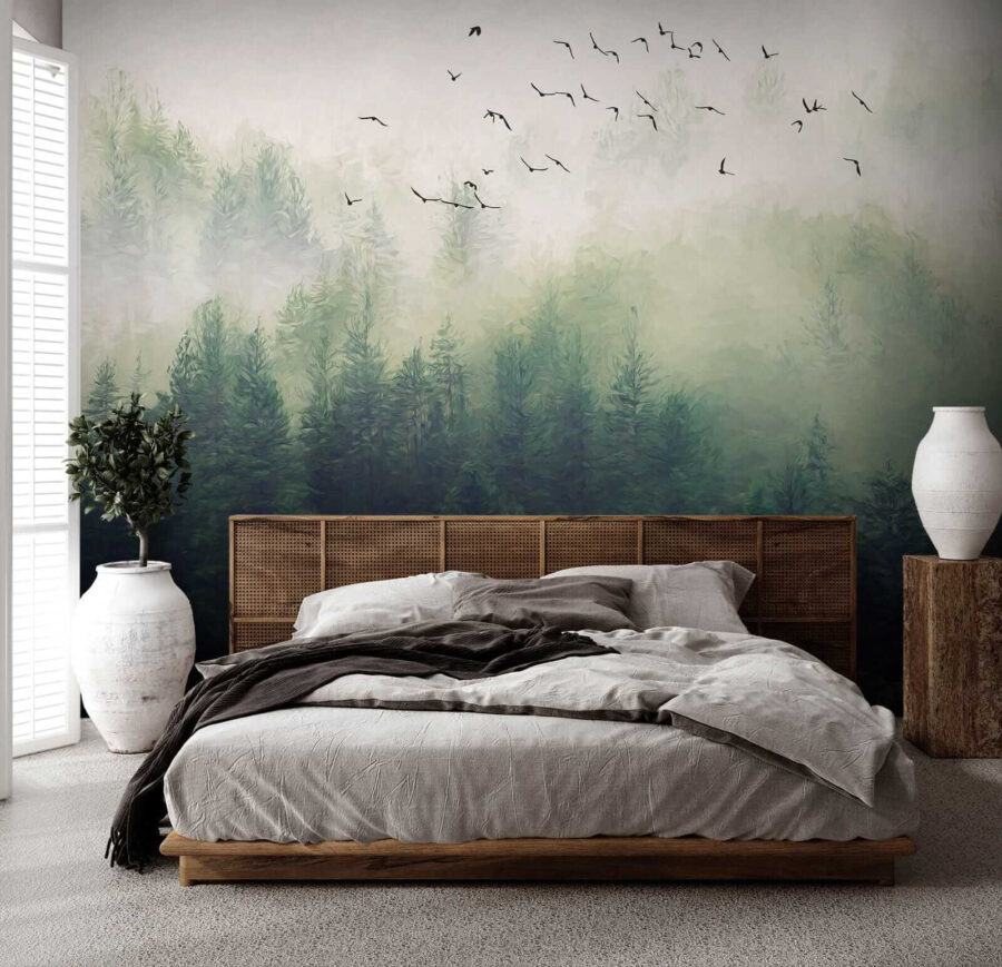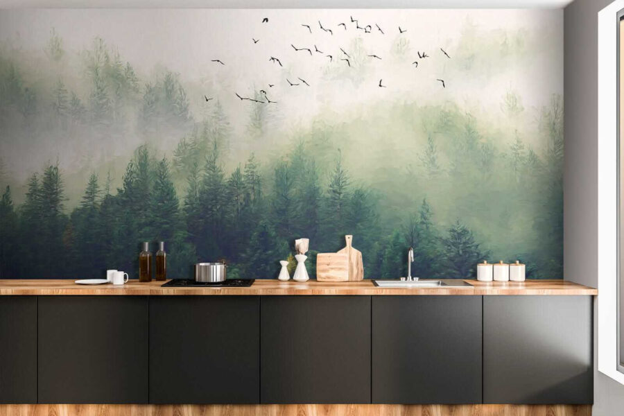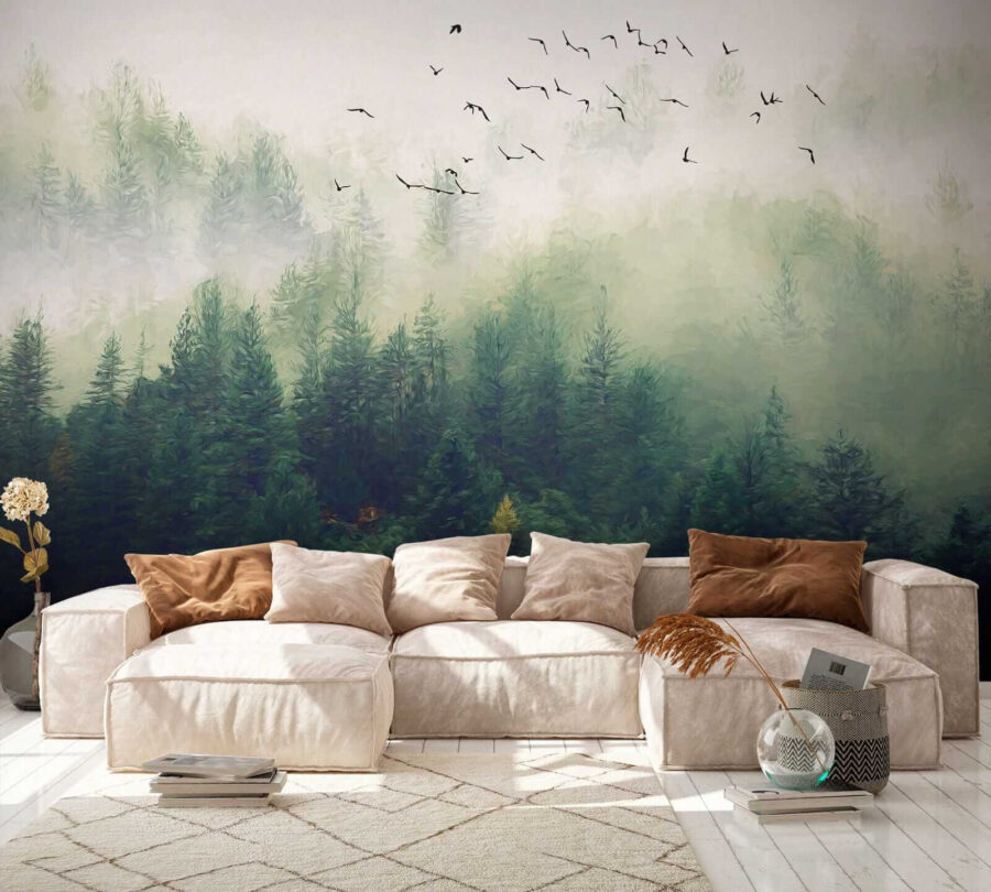 Transformeer uw ruimte met deze prachtige muurschildering met vogels die boven een mistig bos vliegen. Stel u voor dat u uw woonkamer binnenstapt en u zich in een serene omgeving bevindt! De zachte groene tinten en de lichte mist omhullen u als een knusse deken, terwijl de vogels u lijken uit te nodigen om mee te gaan op hun reis. Het is alsof de natuur heeft besloten om zelf uw interieur te decoreren!