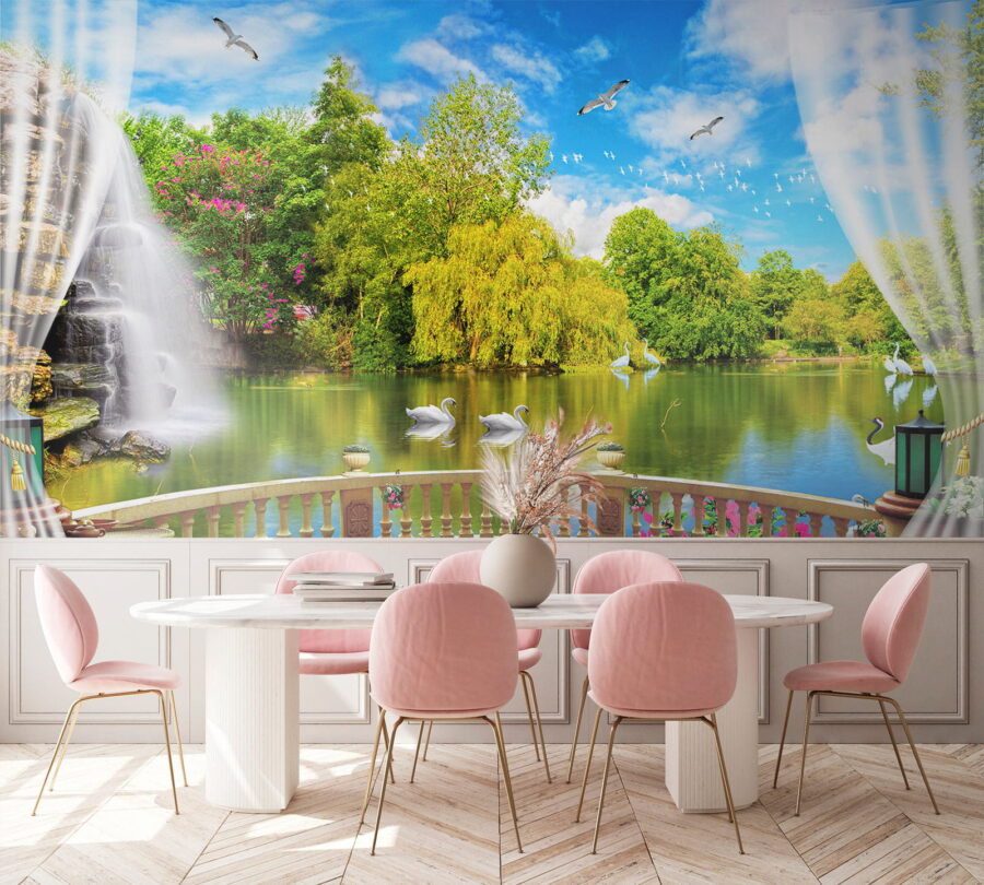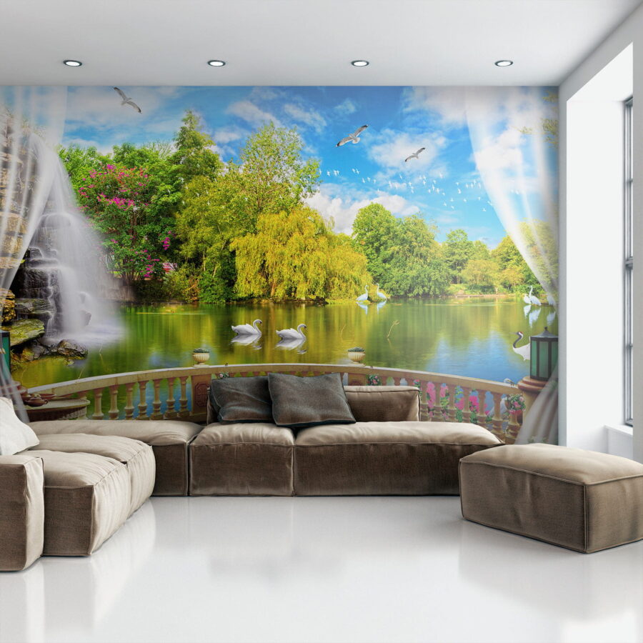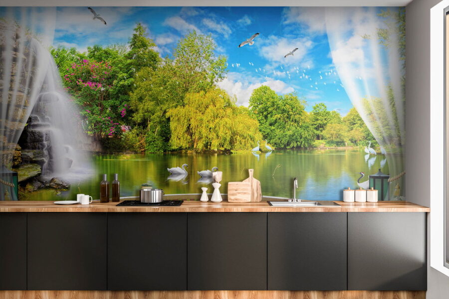 Verander elke kamer in een rustige oase met deze charmante muurschildering, “Uitzicht op een vijver met vogels en bomen”. Stel je voor dat je ‘s ochtends van je koffie nipt en plotseling verdwijnt alle chaos van de wereld – alleen jij, het rustige water en sierlijke zwanen die voorbij glijden. Het levendige groen en het heldere blauw brengen de natuur naar uw muren, waardoor elke dag aanvoelt als een ontspannen wandeling langs het water. Deze muurschildering is perfect voor een gezellig hoekje of een levendige woonkamer en is niet alleen decoratie, maar ook een stukje rust dat fluistert: ‘Haal even adem, u verdient het.’ Is het niet tijd om die rustgevende vibes te omarmen?