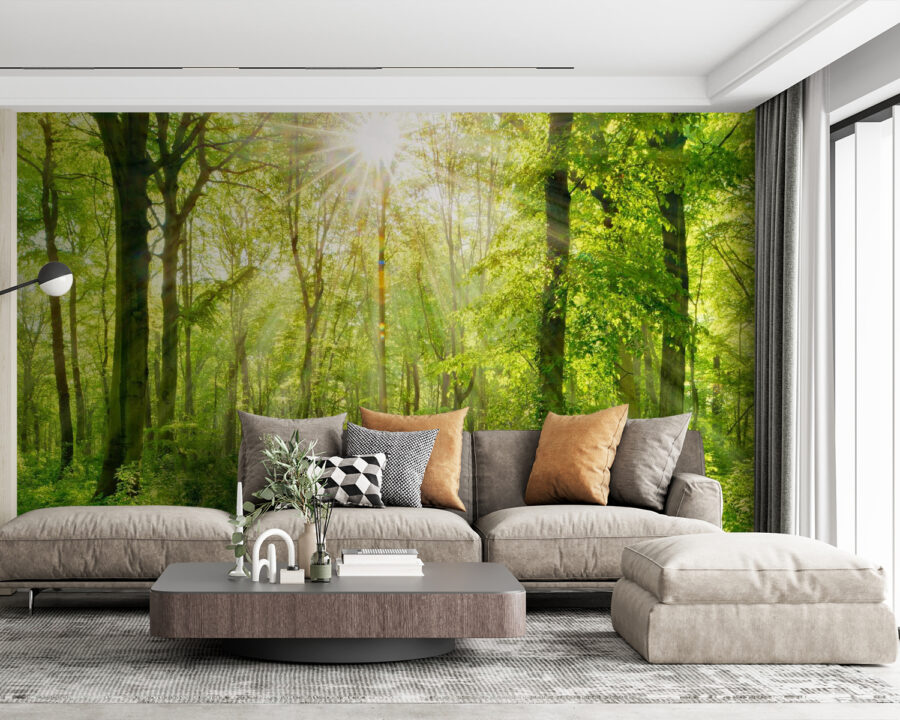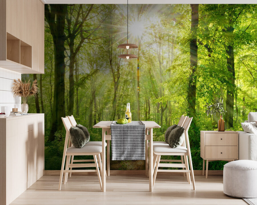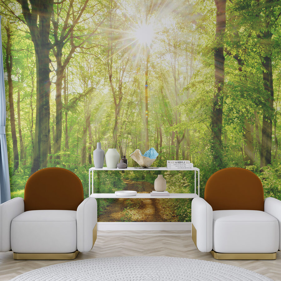 Transformeer je kamer met deze fascinerende muurschildering met zonnestralen die door weelderige bomen priemen. Stel je voor dat je je kamer binnenloopt en het gevoel hebt dat je een rustig bos bent binnengestapt – de ultieme ontspanningszone van de natuur. Het levendige groen straalt en nodigt uit tot kalmte, bijna alsof je het zachte geritsel van de bladeren kunt horen. Of het nu je leeshoek is of een levendige ontmoetingsplek, deze muurschildering speelt een heerlijke truc op je zintuigen. Het is als een frisse wind voor je muren en vormt de perfecte achtergrond voor gezellige praatjes of vredige solomomenten. Bovendien is het gewoon leuk om te bedenken dat een beetje natuur zo’n vreugde binnenshuis kan brengen.