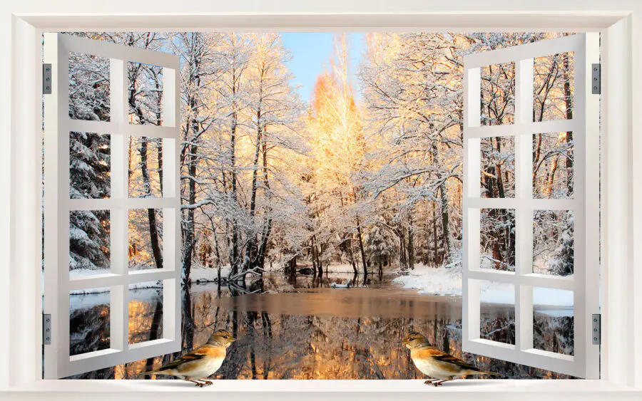 Verander elke kamer in een frisse wind met deze prachtige muurschildering met een speelse scène van vogels die naar een rustig meer turen, omlijst door een gezellig raam. Stel je voor dat je elke dag wakker wordt met dit uitzicht – de zachte glinstering van het water, de besneeuwde bomen die zachtjes glinsteren in het licht en de nieuwsgierige vogels die je aanstaren. Het is alsof je de natuur binnen handbereik hebt. Perfect voor elke sfeer, of het nu een chille woonkamer of een rustige slaapkamer is. Zeg vaarwel tegen saaie muren en laat je ruimte een verhaal vertellen dat elke gast doet opkijken. Een zachte herinnering aan de schoonheid buiten, wachtend om gekoesterd te worden.