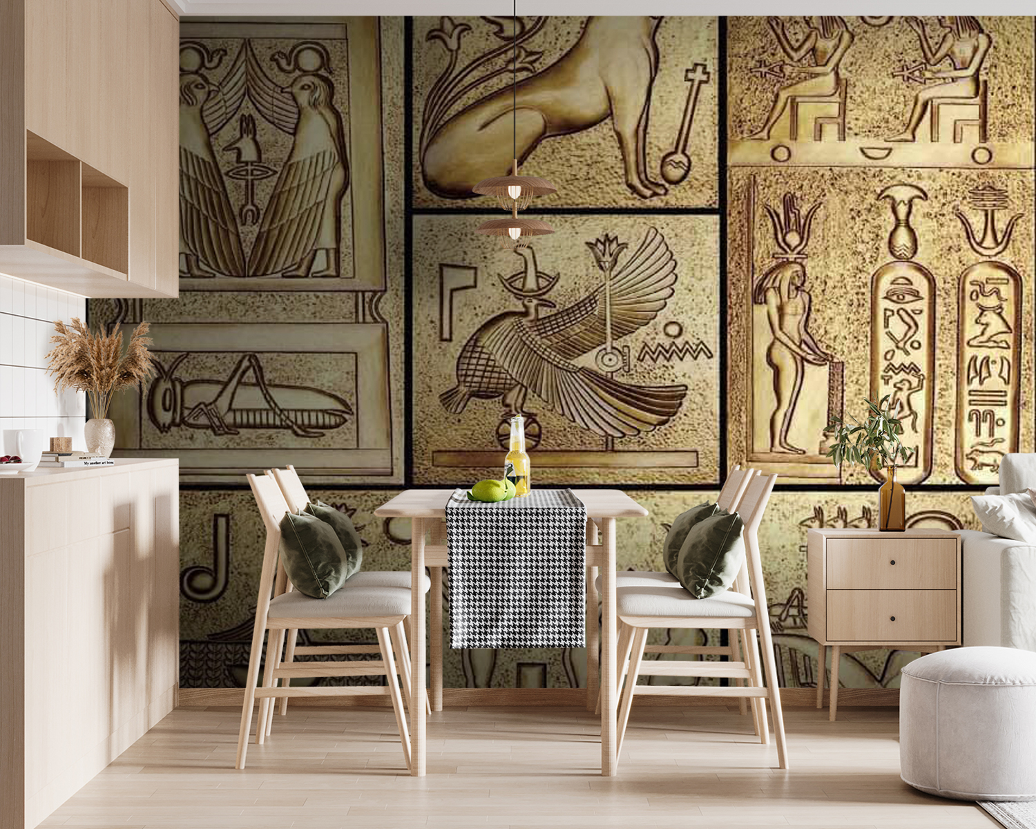 Transformeer je ruimte met deze prachtige collage van Egyptische symbolen uit de oudheid. Het is alsof je een museumtentoonstelling in huis hebt! Stel je voor dat je langs deze muurschildering loopt en de verhalen van farao’s en mystieke goden tot leven voelt komen. Elk ingewikkeld ontwerp nodigt uit tot ontdekken en stimuleert gesprekken die nog lang na het vertrek van de gasten blijven hangen. Het is warm en aards, waardoor elke kamer uitnodigend en een tikkeltje mysterieus aanvoelt – perfect voor mensen die houden van geschiedenis of een beetje eigenzinnigheid in hun inrichting. Stel je voor: een gezellige avond, zachte verlichting en het stille gefluister van oude verhalen om je heen. Bereid je voor op in het oog springende charme!