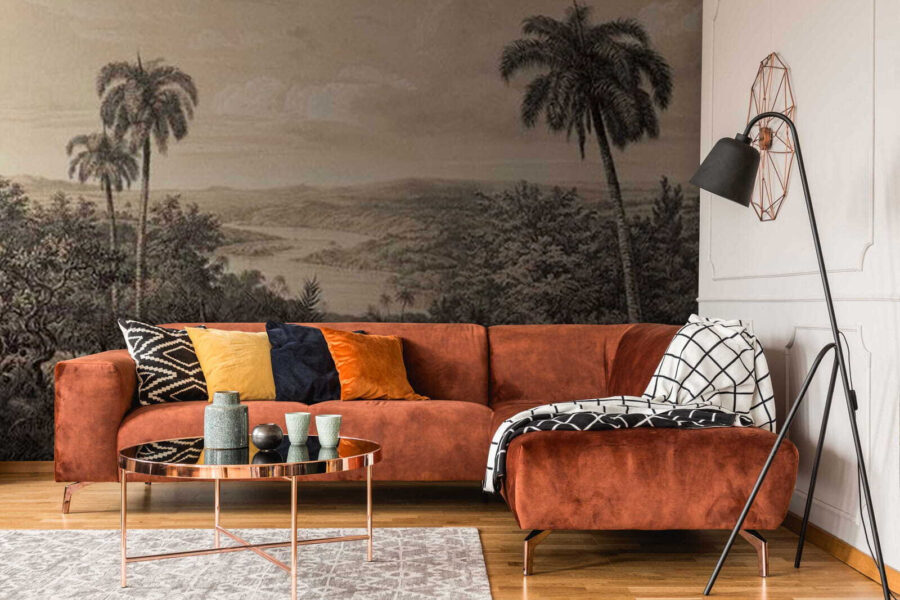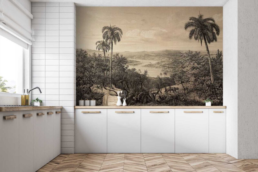 Stel je voor dat je elke keer dat je een kamer binnenkomt een serene paradijselijke omgeving binnenstapt – deze muurschildering maakt dat mogelijk! “Landschap met bomen en een rivier” legt de essentie van de natuur vast met zijn levendige palmbomen en kronkelende rivier, en biedt een vredige ontsnapping aan de dagelijkse drukte. Perfect voor een gezellig leeshoekje of als blikvanger in een woonkamer, het nodigt uit tot dagdromen over weelderige ontsnappingen. Stel je voor dat je ‘s ochtends van je koffie nipt terwijl je uitkijkt over het weelderige groen; het is alsof je een stukje buiten naar binnen haalt. Bovendien creëren de subtiele tinten een rustige sfeer, waardoor het een prachtige achtergrond vormt voor al je favoriete momenten. Wat is er nou fijner dan dat?