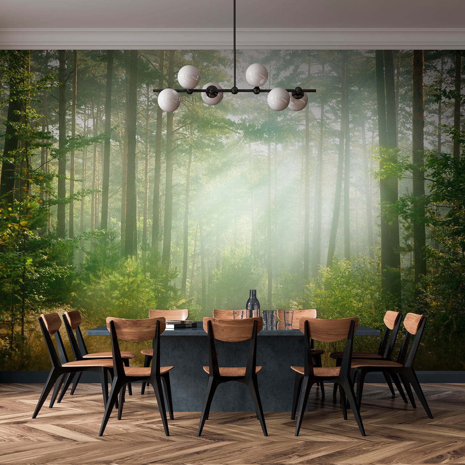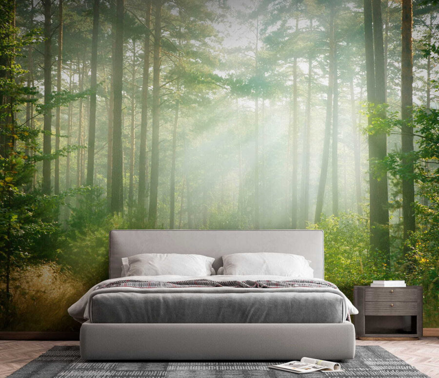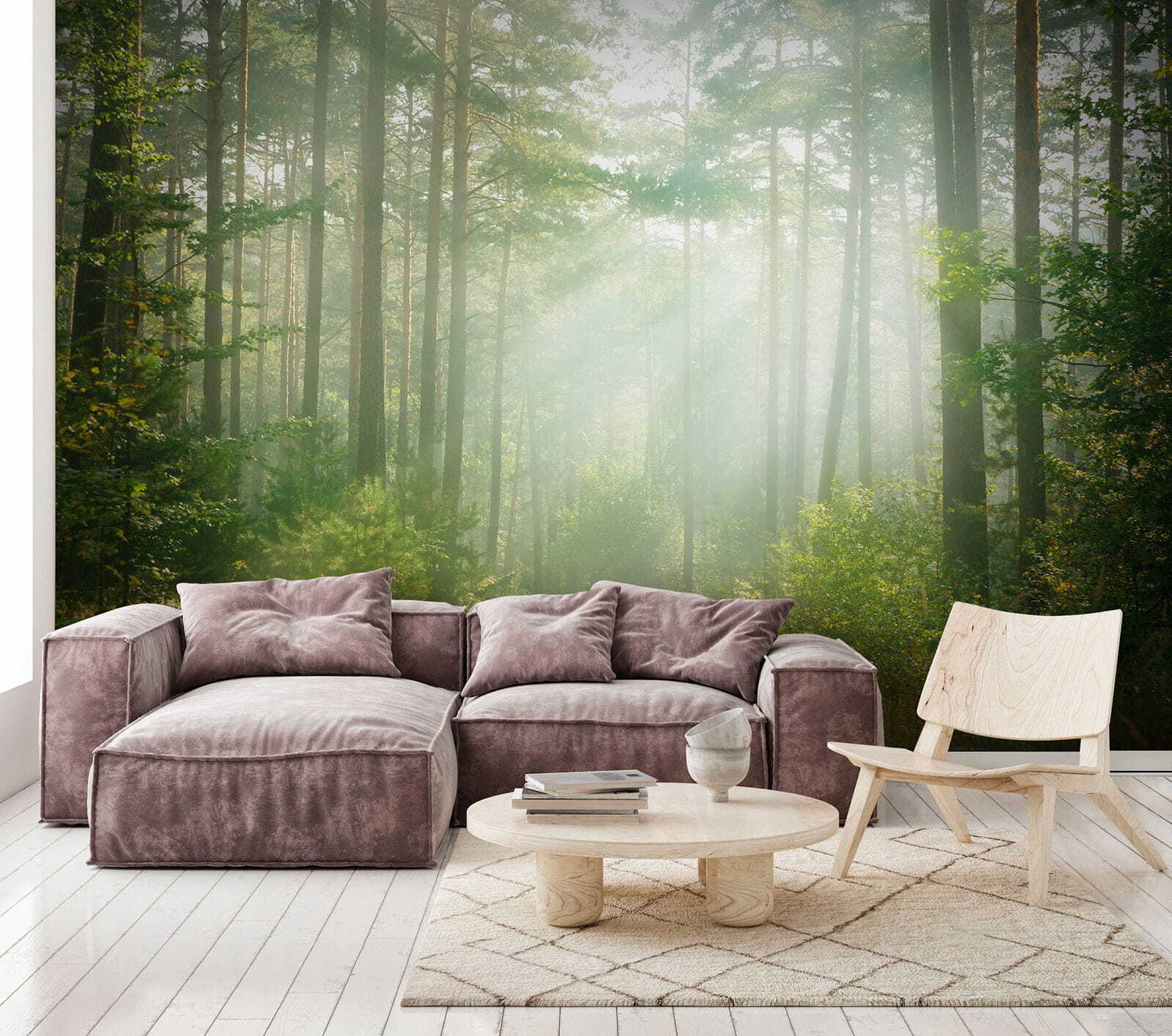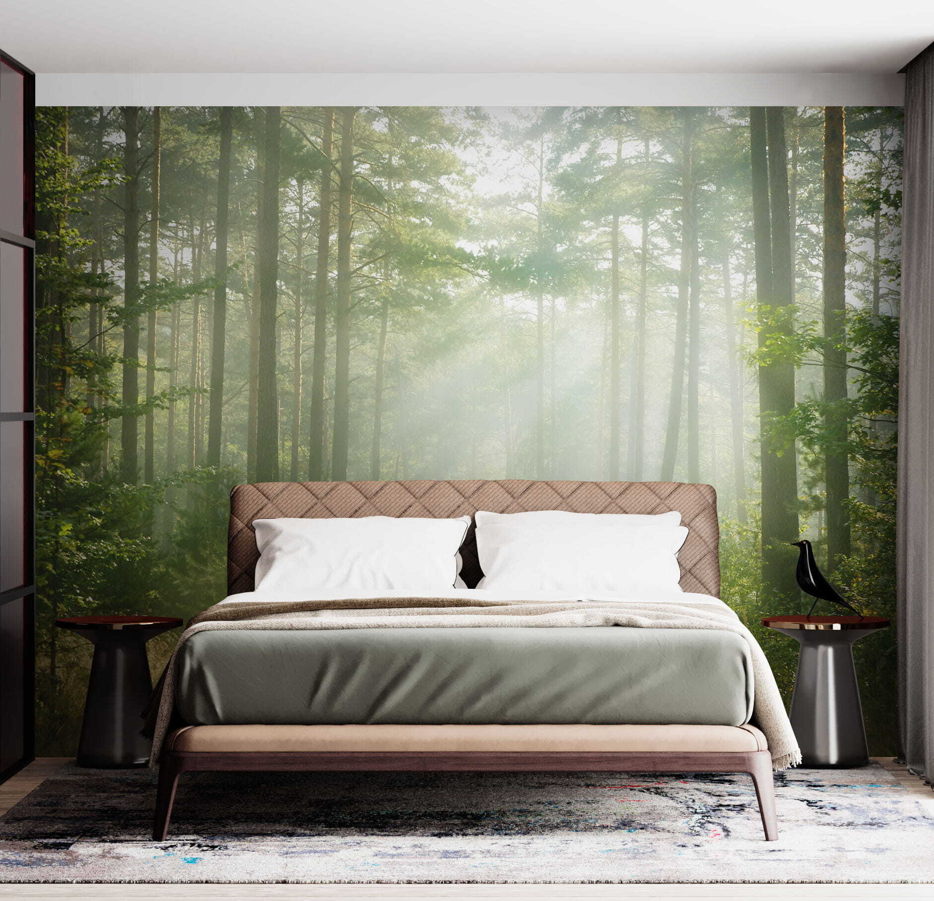 Tover je kamer om in een sereen boslandschap met deze muurschildering met zonlicht dat door hoge bomen stroomt. Stel je voor dat je een zonovergoten bos binnenstapt elke keer dat je de kamer binnenloopt – heerlijk dromerig, toch? De zachte gloed van het licht dat door de bladeren filtert brengt warmte en rust, waardoor het perfect is voor een gezellige leeshoek of een levendige woonkamer. Het is als een frisse wind zonder vervelende insecten. Of je nu thee drinkt of dagdroomt, deze muurschildering nodigt uit tot momenten van rust en inspiratie. Verfraai je muren en laat de magie van de natuur binnen!