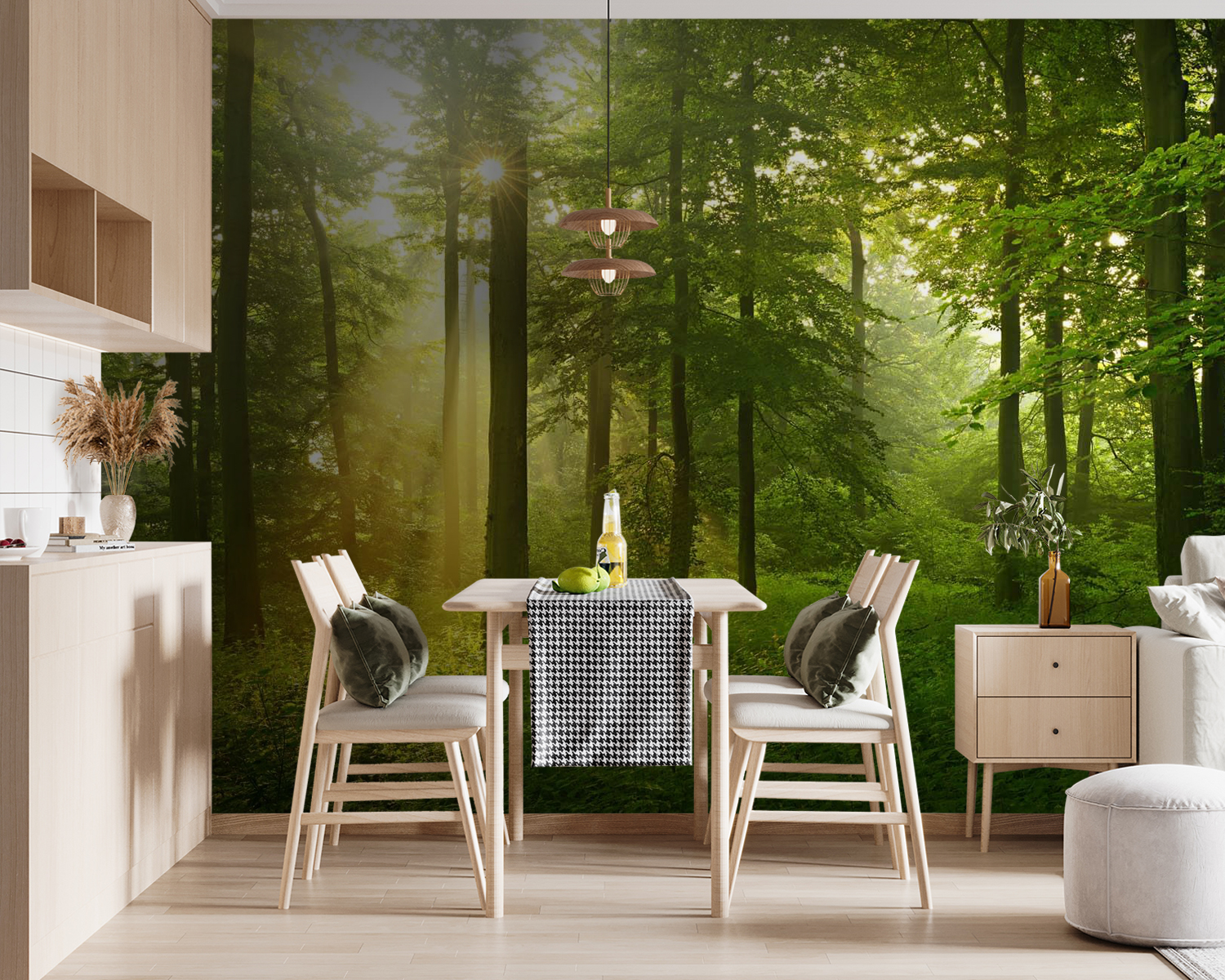 Transformeer je ruimte met deze betoverende muurschildering die de sereniteit van een zonovergoten bos bij je thuis introduceert. Stel je zachte stralen voor die door weelderige groene bladeren filteren en een warme, uitnodigende sfeer creëren die je het gevoel geeft dat je de natuur bent binnengestapt. Dit stuk voegt niet alleen kleur toe, het brengt leven in de kamer en laat je dagdromen over boswandelingen.