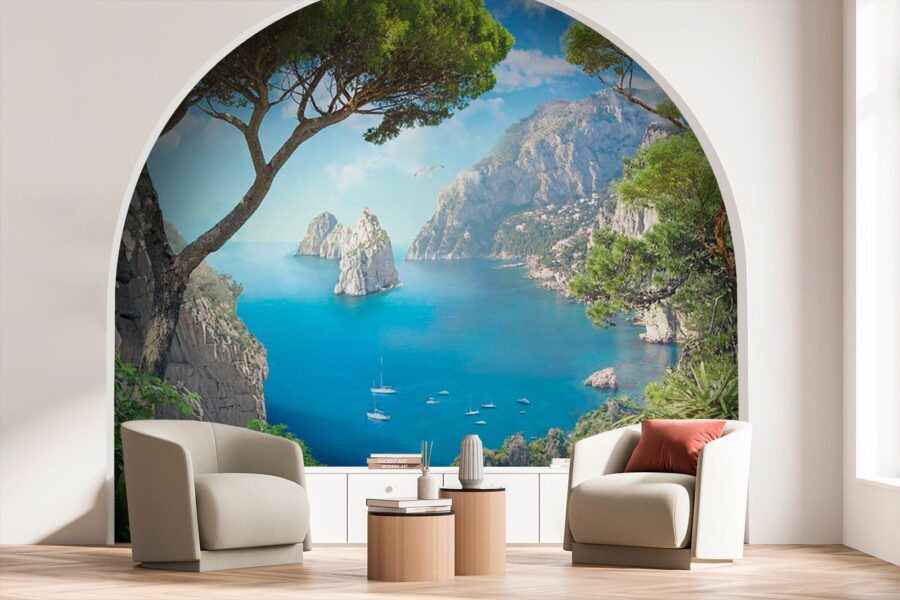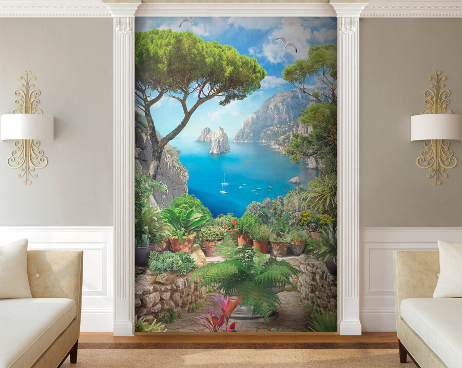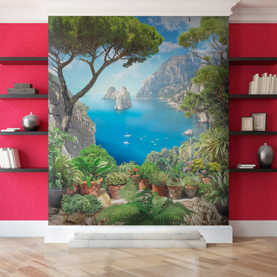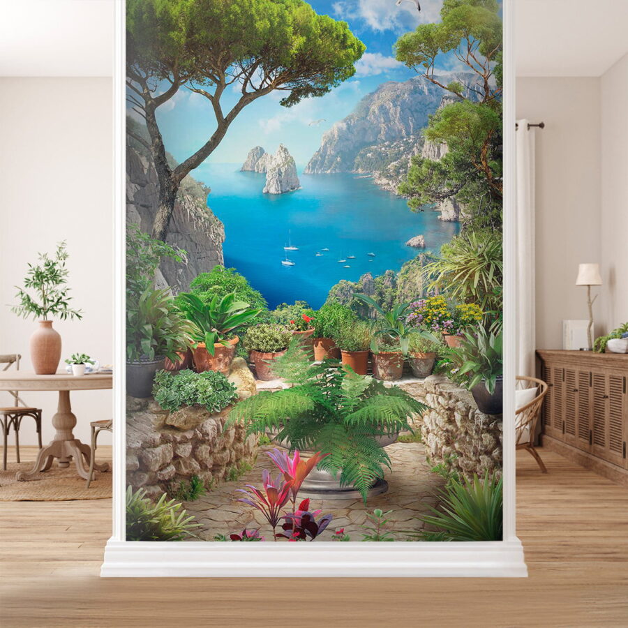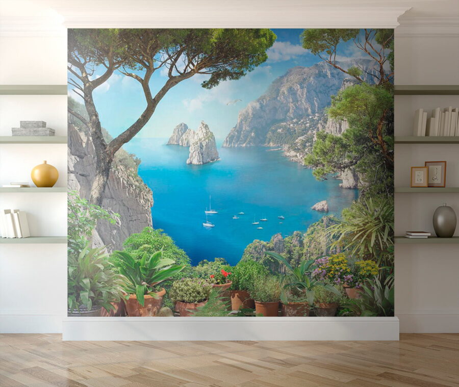 Verander een saaie muur in een adembenemende ontsnapping met deze prachtige muurschildering, “Uitzicht op de oceaan vanaf een klif”. Stel je voor dat je koffie drinkt terwijl je geniet van levendig blauw en weelderig groen, alsof je vanaf een klif uitkijkt over de glinsterende zee. Deze muurschildering is als een mini-vakantie elke dag! Het legt de schoonheid van de natuur vast met charmante potplanten die een gezellige touch toevoegen. Stel je voor dat de vogels fluiten en dat de zilte zeewind waait… Oké, misschien niet, maar een meisje mag dromen, toch? Dit kunstwerk is perfect voor woonkamers of gezellige hoekjes en nodigt uit tot dagdromen over serene kusten en zachte golven.