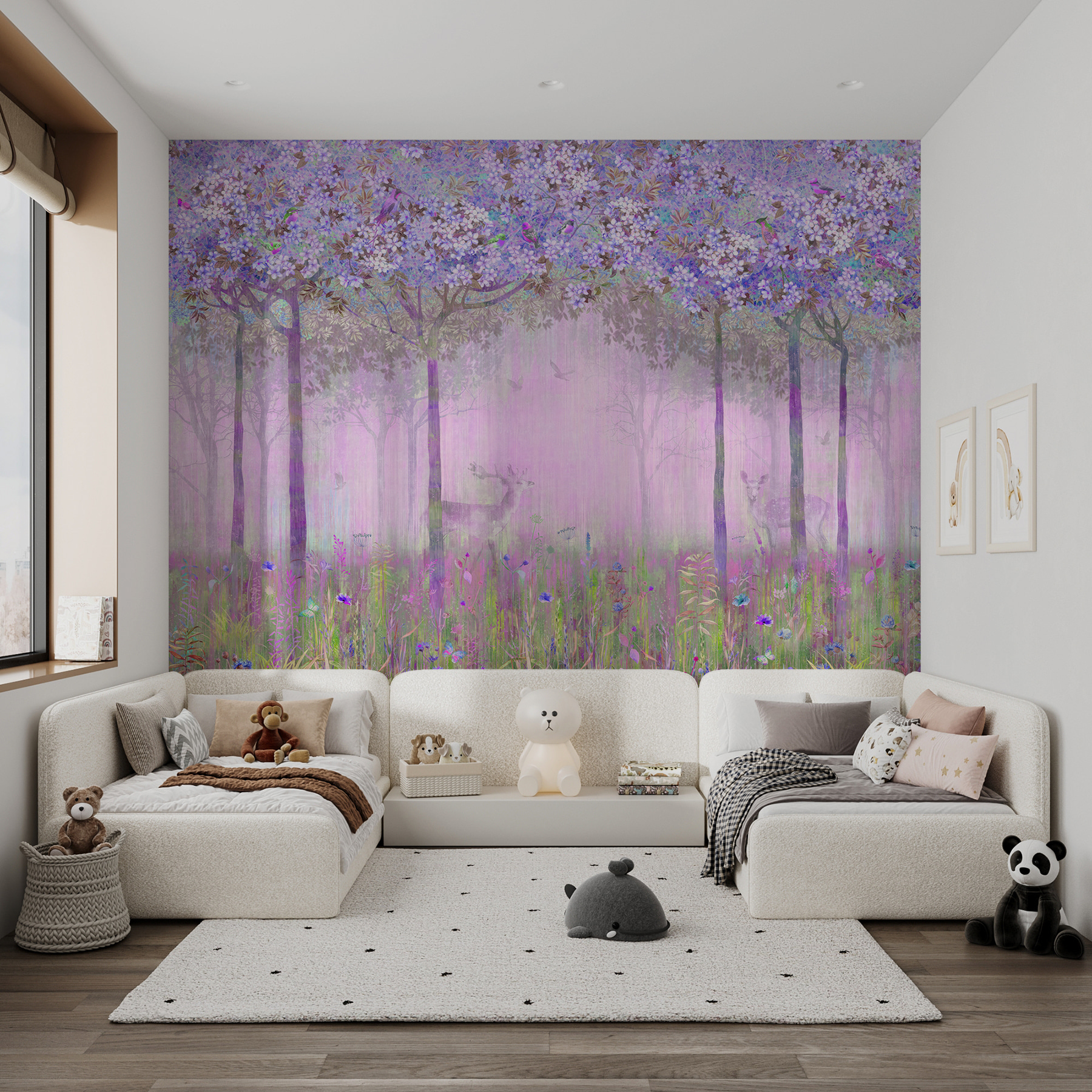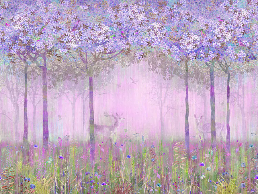 Als je een vleugje magie en eigenzinnigheid wilt toevoegen aan een kamer, dan is deze “Muurschildering van bloemen en gras” een absolute droom. Stel je voor dat je een sprookjesbos binnenstapt telkens als je de kamer binnenloopt. Deze muurschildering, overspoeld met zacht lavendel en delicaat groen, voelt aan als een serene lentemorgen. Je kunt de fluisterende bladeren bijna horen en de herten door de mist zien gluren.