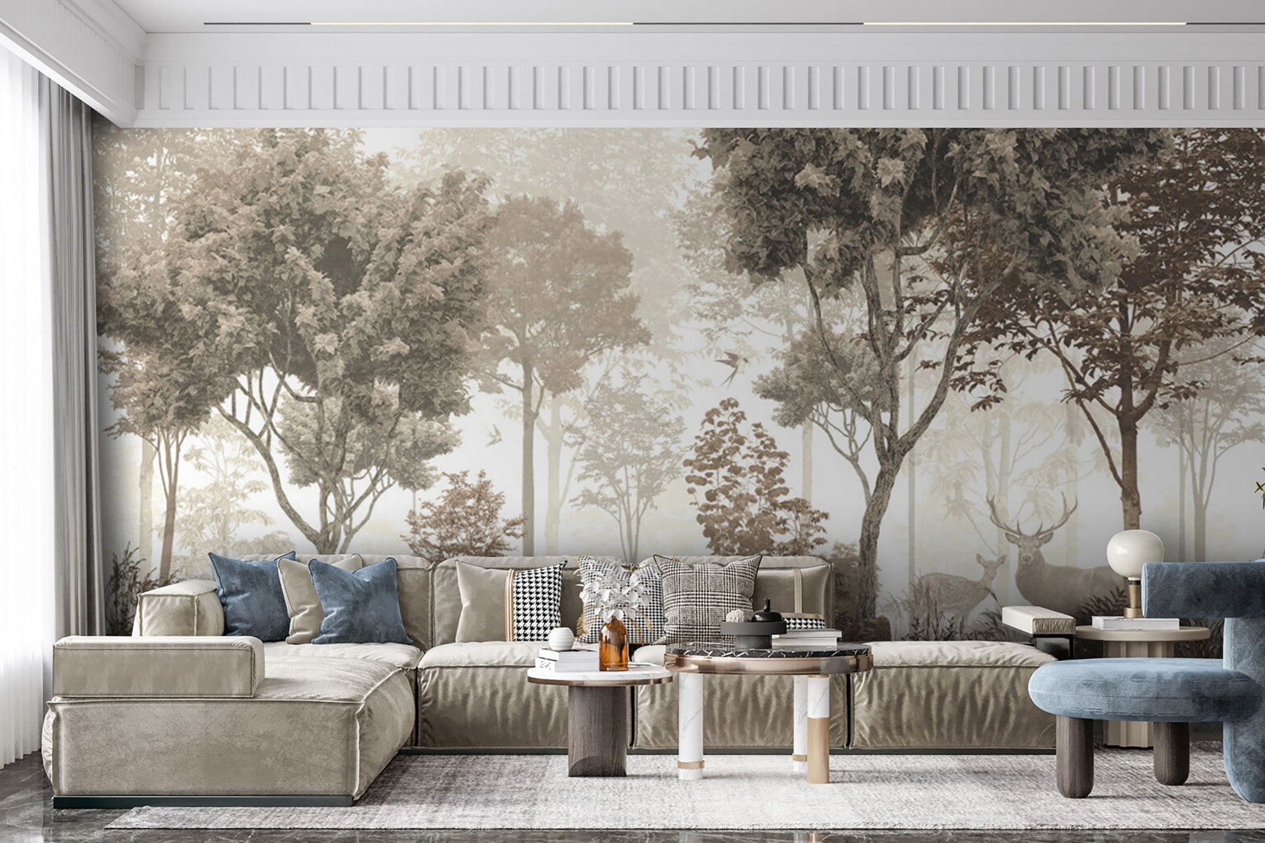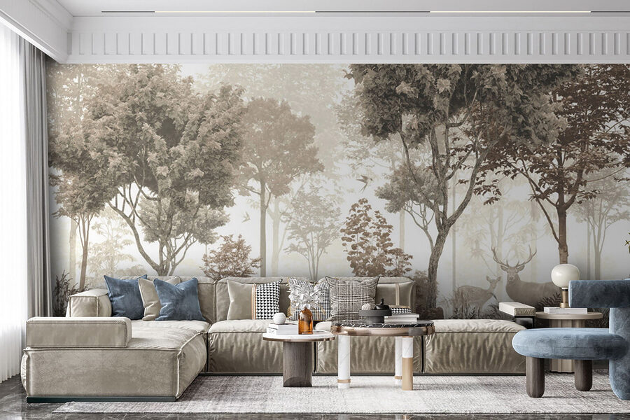 Stel je dit voor in je woonkamer of zelfs in een gezellige leeshoek – het zal zeker een serene, dromerige sfeer oproepen. Bovendien zijn die zachte, neutrale kleuren zo rustgevend. Voelt als een diepe teug frisse boslucht. Of je nu een natuurliefhebber bent of iemand die gewoon een rustig tintje aan je ruimte wil geven, deze muurschildering doet het werk prachtig.