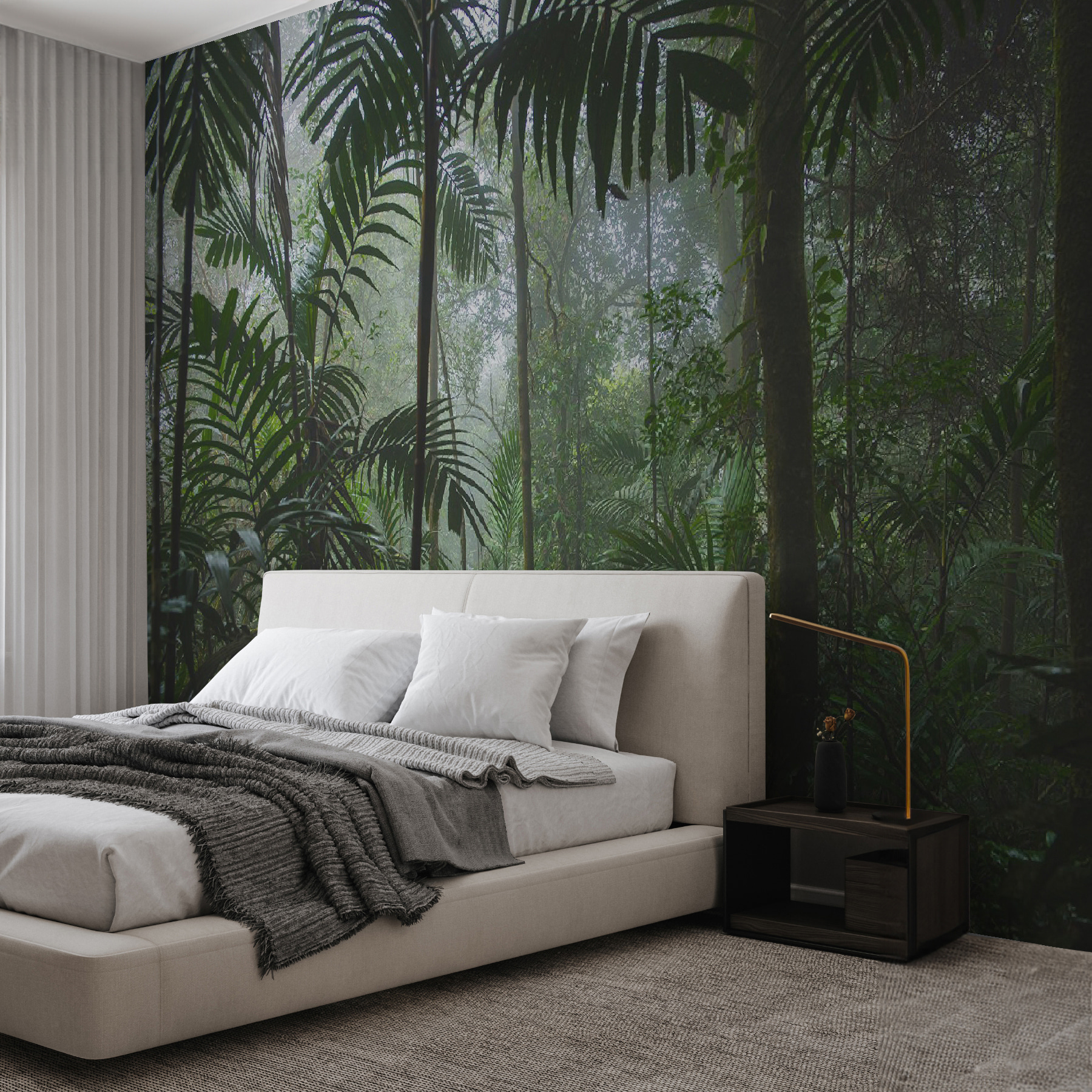 Stel je voor dat je een dichte, mistige jungle binnenstapt – gewoon in je eigen huis. Dat is wat deze “Dichte jungle met mistige sfeer” muurschildering in je interieur brengt. Het is alsof je de magie van een mistig bosmoment, bevroren in de tijd, op je muur hebt. Het diepe groen en de zachte, omhullende mist nodigen je uit om te ontspannen en misschien zelfs een beetje te dagdromen over avonturen in de natuur. Perfect voor elke kamer die een vleugje natuur of een rustgevende sfeer nodig heeft. Past prachtig bij houten meubels, vind je niet? Een kleine ontsnapping aan de alledaagse drukte zonder naar buiten te hoeven.