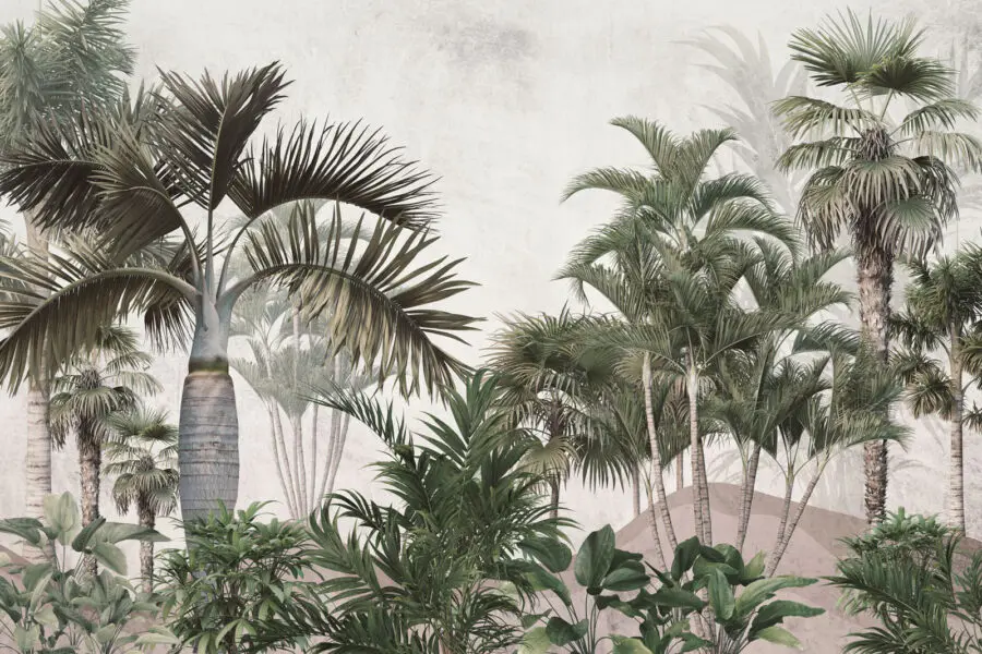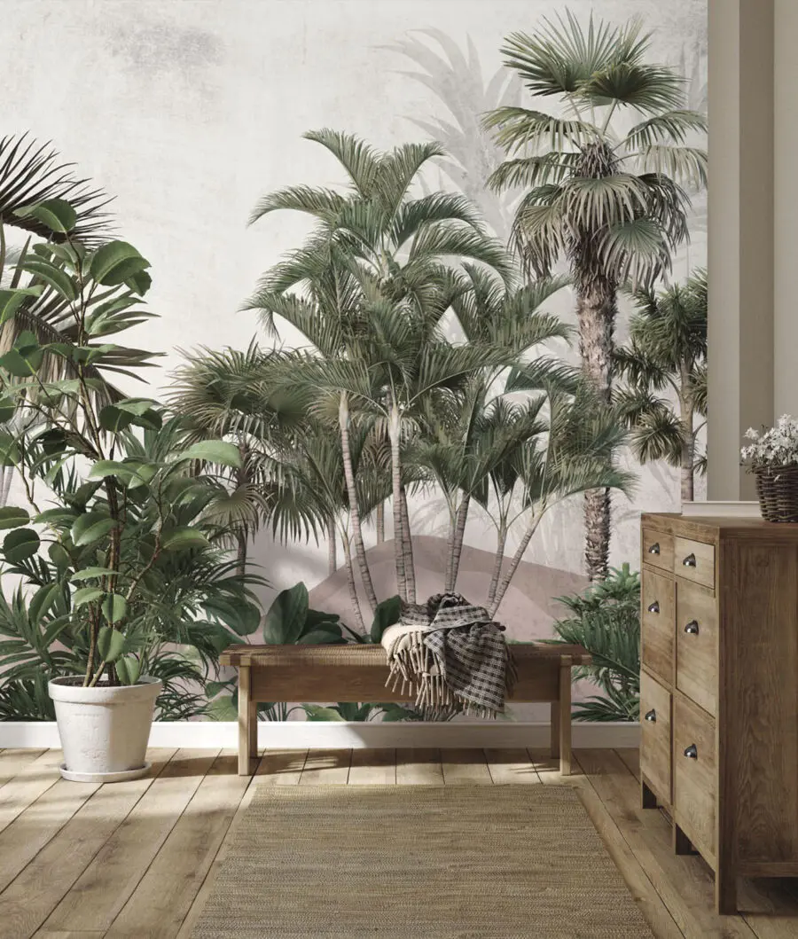 Verander elke kamer in een rustgevende oase met deze levendige muurschildering van een tropisch paradijs. Stel je voor dat je elke dag wakker wordt met weelderig groen en wuivende palmen, terwijl je geniet van je ochtendkoffie. Het is alsof je thuis op minivakantie gaat – inpakken is niet nodig! De zachte kleuren creëren een kalme sfeer die gemakkelijk te combineren is met gezellige meubels of felle accenten. Vrienden kunnen binnenlopen, diep ademhalen en zeggen: “Wow, waar is het strand?”. Een perfecte achtergrond voor ontspannen avonden of levendige bijeenkomsten, het is prachtig hoe een vleugje natuur een ruimte levendig en uitnodigend kan maken.