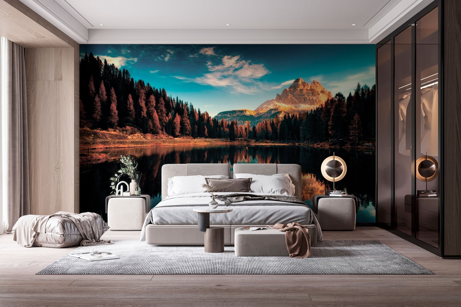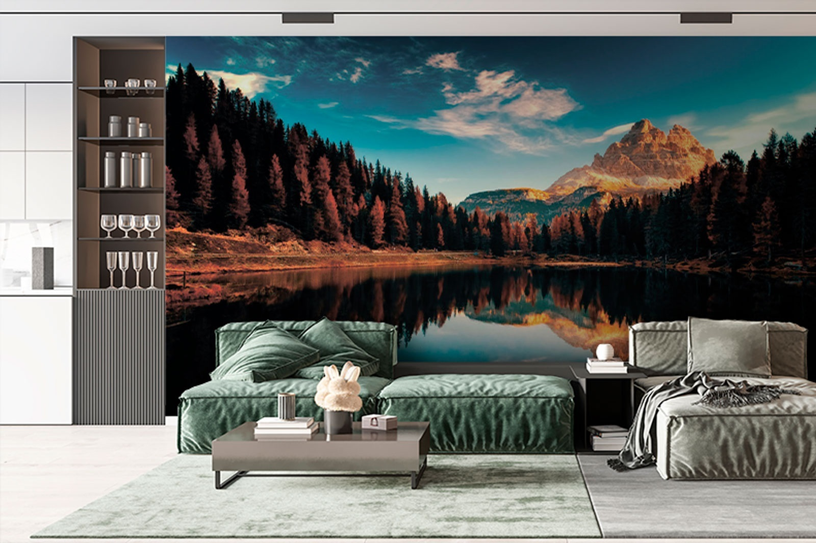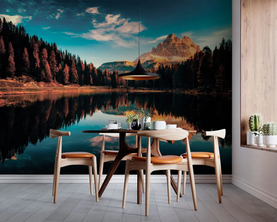 Stel je voor dat je een gezellige ruimte binnenstapt en boem – deze prachtige muurschildering van een rustig meer omringd door majestueuze bomen en bergen springt meteen in het oog. Het is net een minivakantie aan je muur! De kleuren zijn zo rijk dat ze je bijna uitnodigen om je tenen in het water te dompelen. Stel je voor dat je vrienden ontvangt en iedereen een gevoel van rust over zich heen voelt komen terwijl ze kletsen en van hun drankjes nippen, terwijl ze naar dit meesterwerk staren. Het is niet alleen wanddecoratie; het is een sfeermaker, een opvallend stuk dat elke kamer verandert in een toevluchtsoord in de natuur. Hoor je niet het zachte geklots van het water en het ruisen van de bomen? Deze muurschildering brengt een stukje buiten naar binnen – perfect om te dagdromen of je volgende avontuur te plannen. Wie zou dat niet willen?