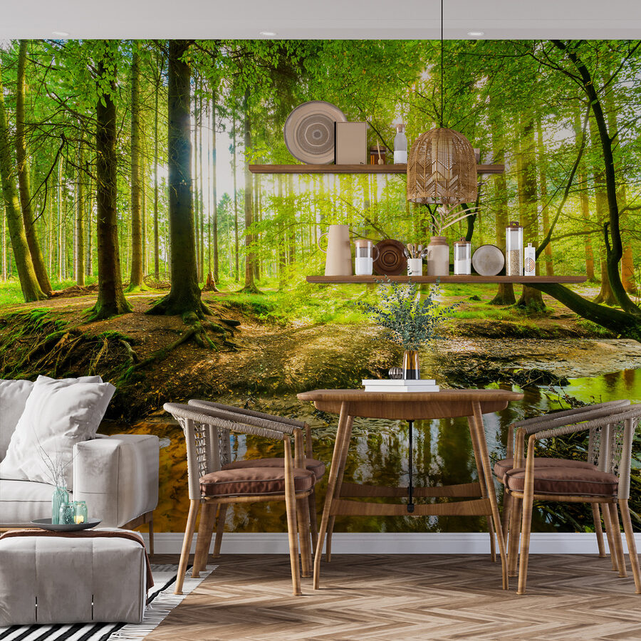 Stel je voor dat je in je eigen kleine toevluchtsoord in het bos stapt telkens als je de kamer binnenloopt. Deze muurschildering brengt een levendig boslandschap naar je kamer, compleet met hoge bomen en zonlicht dat door de bladeren filtert. Het is alsof de natuur zelf heeft besloten om hier te komen wonen. Stel je voor dat je je lekker nestelt met een goed boek, omringd door groene tinten en de zachte, aardse sfeer van een bosgrond. En hé, als je ooit een moment nodig hebt om aan de dagelijkse sleur te ontsnappen, dan is deze muurschildering er voor jou. Perfect om te dagdromen over wandelingen en avonturen in de buitenlucht, of om gewoon te genieten van een gezellige avond binnenshuis. Het is een vleugje rust dat een grote impact heeft en elke muur in een frisse wind verandert. Wie kan dat weerstaan?