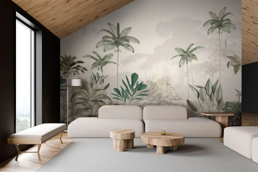 Stel je voor dat je je eigen tropische toevluchtsoord binnenstapt telkens als je de kamer binnenloopt – dat is precies wat deze muurschildering, “Tropical Trees in Misty Forest”, je te bieden heeft. Denk aan weelderige, groene palmen die zachtjes wiegen in lagen zacht, mistig bos op de achtergrond. De groentinten zijn rustgevend, maar toch levendig genoeg om een vleugje natuur toe te voegen. Het is alsof je een eeuwig regenwoud in huis hebt. Perfect voor de natuurliefhebber die zijn dagelijkse dosis buitenlucht mist. Deze muurschildering voelt levendig aan, bijna alsof je de ochtendnevel op je huid kunt voelen en het zachte geritsel van de bladeren kunt horen. Het is een mooie balans tussen sereen en opbeurend, waardoor het ideaal is voor het creëren van een chille, vredige sfeer in je woonkamer, slaapkamer of zelfs een gezellige leeshoek. Bovendien is het een geweldige gespreksstarter voor gasten – wie wil er nou niet verdwalen in dit dromerige bos?