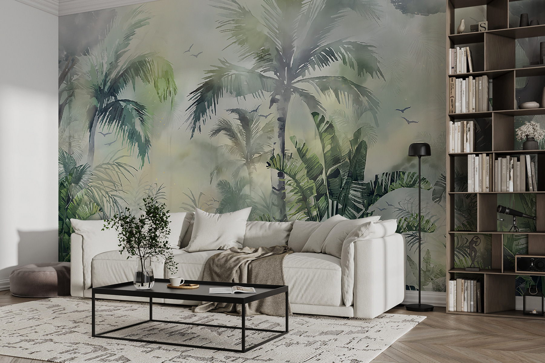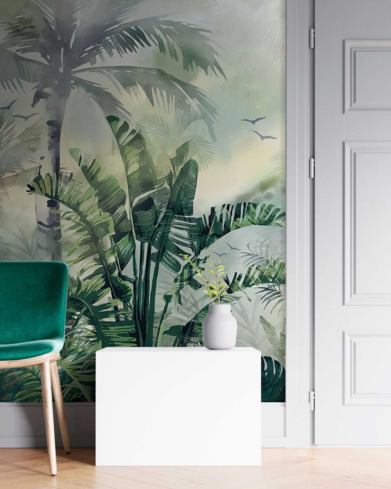 Tover elke kamer om in een weelderig paradijs met deze prachtige muurschildering van een mistige jungle. Stel je voor dat je door dicht gebladerte wandelt en frisse lucht inademt-ah, de sereniteit! Het is alsof je thuis op minivakantie bent, maar dan zonder de reisstress. Het zachte groen en de zachte mist nodigen uit tot kalmte, perfect voor een knusse leeshoek of een serene slaapkamer. En wie wil er nu niet elke dag het gevoel hebben dat hij of zij aan het nippen is van een drankje op een tropisch uitje? Maak je klaar om het avontuur van de natuur te omarmen, gewoon vanuit je luie stoel.