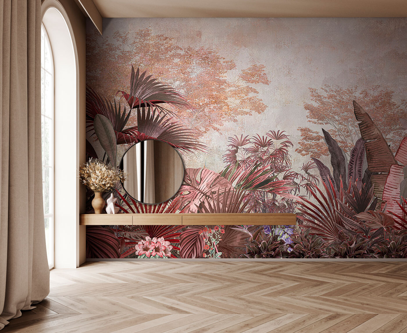 Heb je er ooit van gedroomd om in een tropisch oerwoud te luieren zonder door je shirt heen te zweten? Met deze muurschildering “Tropical Foliage” zit je goed. Met zijn gedempte kleuren en weelderige ontwerp is het alsof je een klein paradijs in huis haalt. Stel je voor dat je ‘s ochtends aan je koffie nipt terwijl je omringd bent door palmbladeren en junglebomen, zonder je zorgen te maken over insecten of vochtigheid. Perfect om je woonkamer op te fleuren of een gezellig leeshoekje te creëren. Bovendien zullen gasten waarschijnlijk denken dat je een groene vingers hebt – je hoeft de bonen niet te vertellen! Het is een gespreksstarter en een mini-vakantie in één prachtige muurschildering.