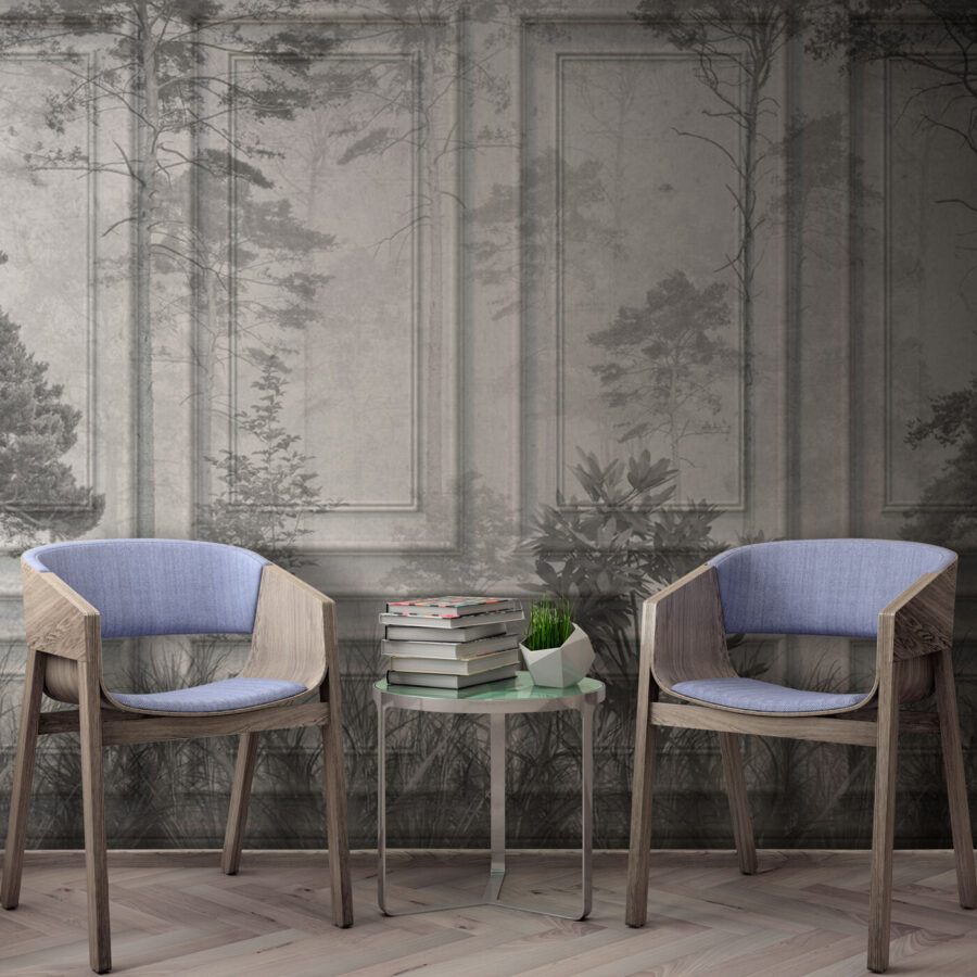 Stel je eens voor dat je een kamer binnenstapt waar de natuur gezellig samengaat met klassieke architectuur. Dat is wat deze muurschildering doet. Het is alsof je een serene bosgezicht in een chique bibliotheek brengt. De gedempte tinten lopen zo vloeiend in elkaar over, alsof je op een regenachtige dag in een tijdloze roman valt. Er is een rustgevend effect – perfect voor een leeshoekje of een woonkamer waar je gewoon rustig wilt ademhalen. De textuur met een boiserie-effect? Dat voegt een geraffineerde flair toe, waardoor je ruimte elegant maar toch uitnodigend aanvoelt. Gasten zullen onder de indruk zijn, maar wat nog belangrijker is, jij zult het gevoel hebben dat je een stukje rust in huis hebt.