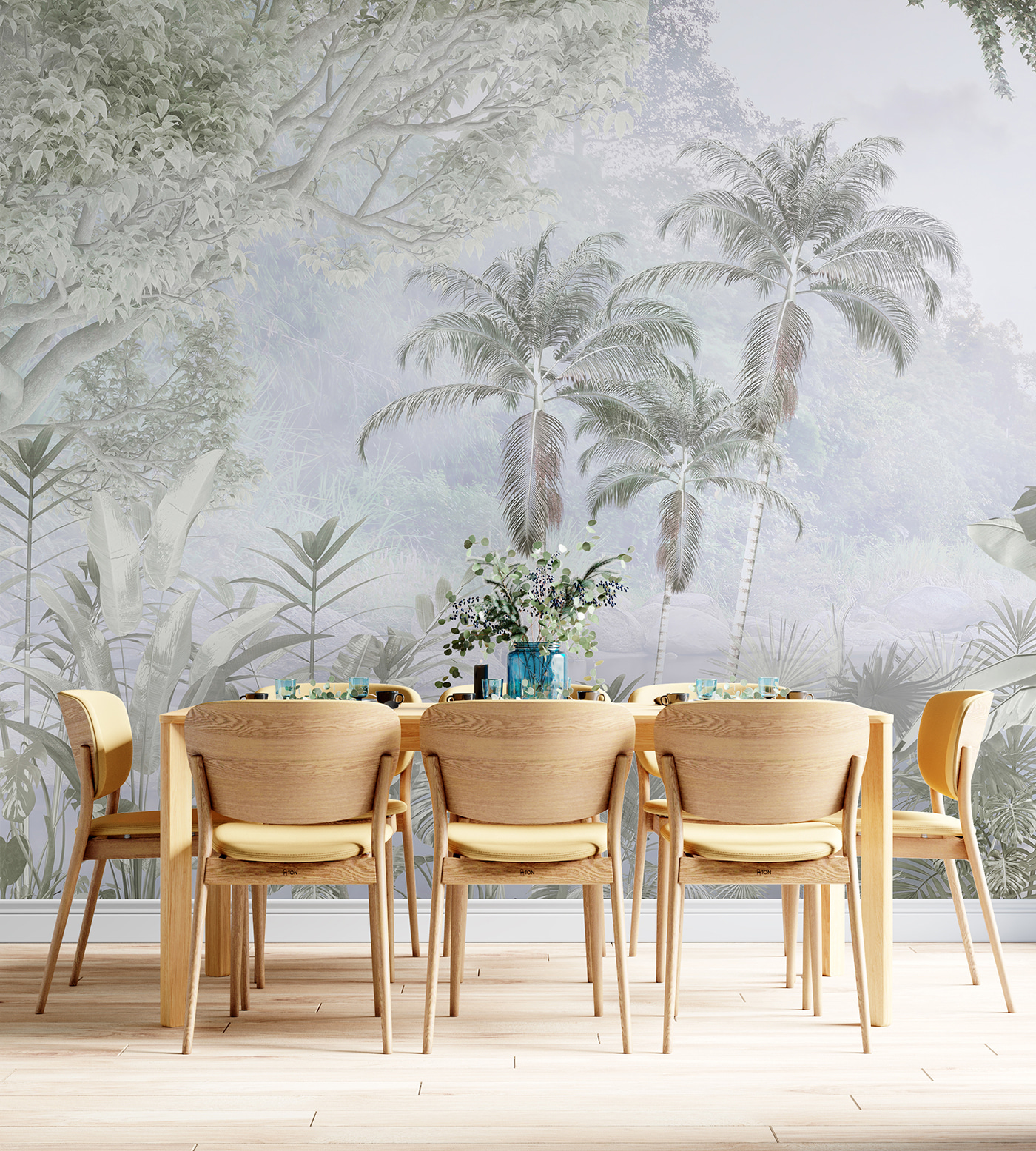 Verander elke ruimte in een luchtige ontsnapping met deze muurschildering met een weelderige groep palmbomen. Het is alsof je een stukje paradijs in je woonkamer hebt – stel je voor dat je koffie drinkt terwijl je naar die wuivende palmen staart. De zachte kleuren voegen een rustgevende sfeer toe, perfect voor een vredig toevluchtsoord. Misschien is het de achtergrond voor gezellige filmavonden of een perfecte plek voor die eindeloze zoomgesprekken – wie wil er nu geen tropisch paradijs achter zich? Deze muurschildering is eigenlijk een vakantie waarvoor je niets hoeft in te pakken. Je muren verdienen een beetje plezier, toch?