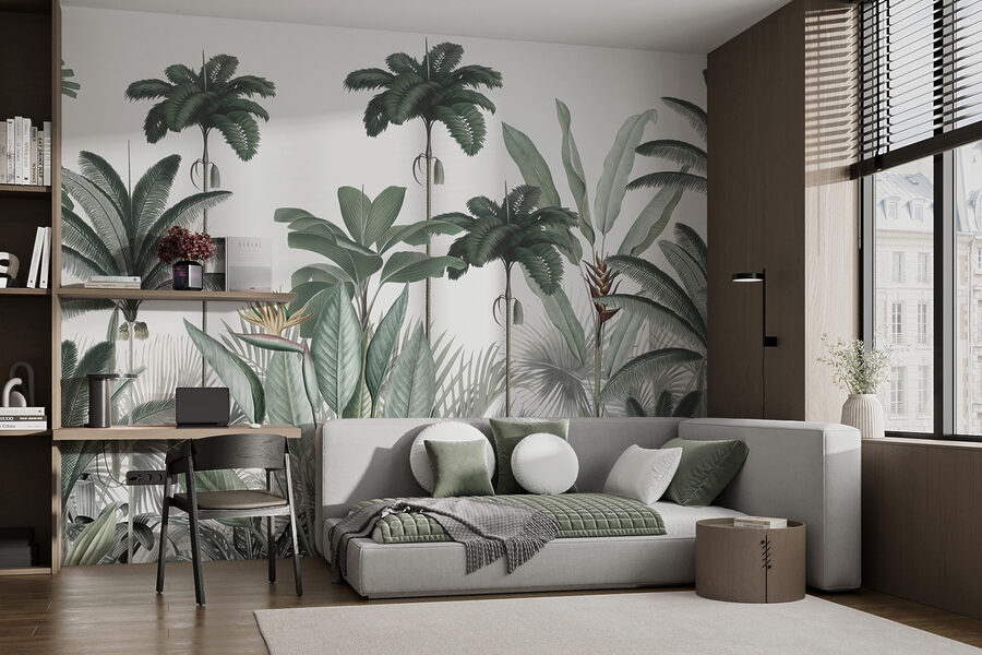 Stel je voor dat je een weelderig tropisch paradijs binnenstapt zonder je huis te verlaten. Deze muurschildering “Tropisch paradijs met weelderig groen” bevat alle exotische sferen waarnaar je hunkert. Hoge palmbomen die zachtjes wiegen, levendige bladeren die bijna lijken te ritselen in een niet-bestaand briesje – het is een minivakantie telkens als je ernaar kijkt. Perfect voor iedereen die droomt van een eilandvakantie. Het verandert elke saaie ruimte in een indoor jungle!