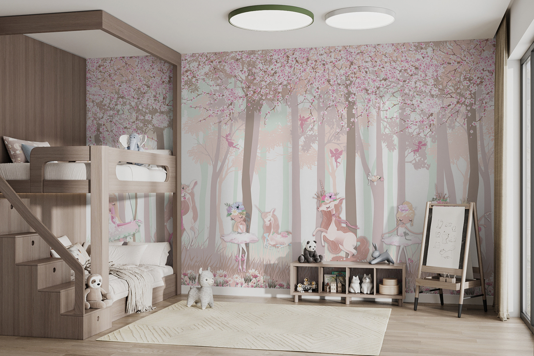 Stel je voor dat je een sprookje binnenstapt elke keer als je de kamer binnenkomt! Deze prachtige “Fotobehang Cartoon of a Ballerina” is perfect voor het creëren van een dromerige kinderkamer of het toevoegen van een vleugje eigenzinnigheid aan de kamer van je dochter. De zachte pasteltinten en magische bosgezichten, compleet met elegante ballerina’s en sierlijke eenhoorns, geven je het gevoel dat je door een betoverd bos wandelt.