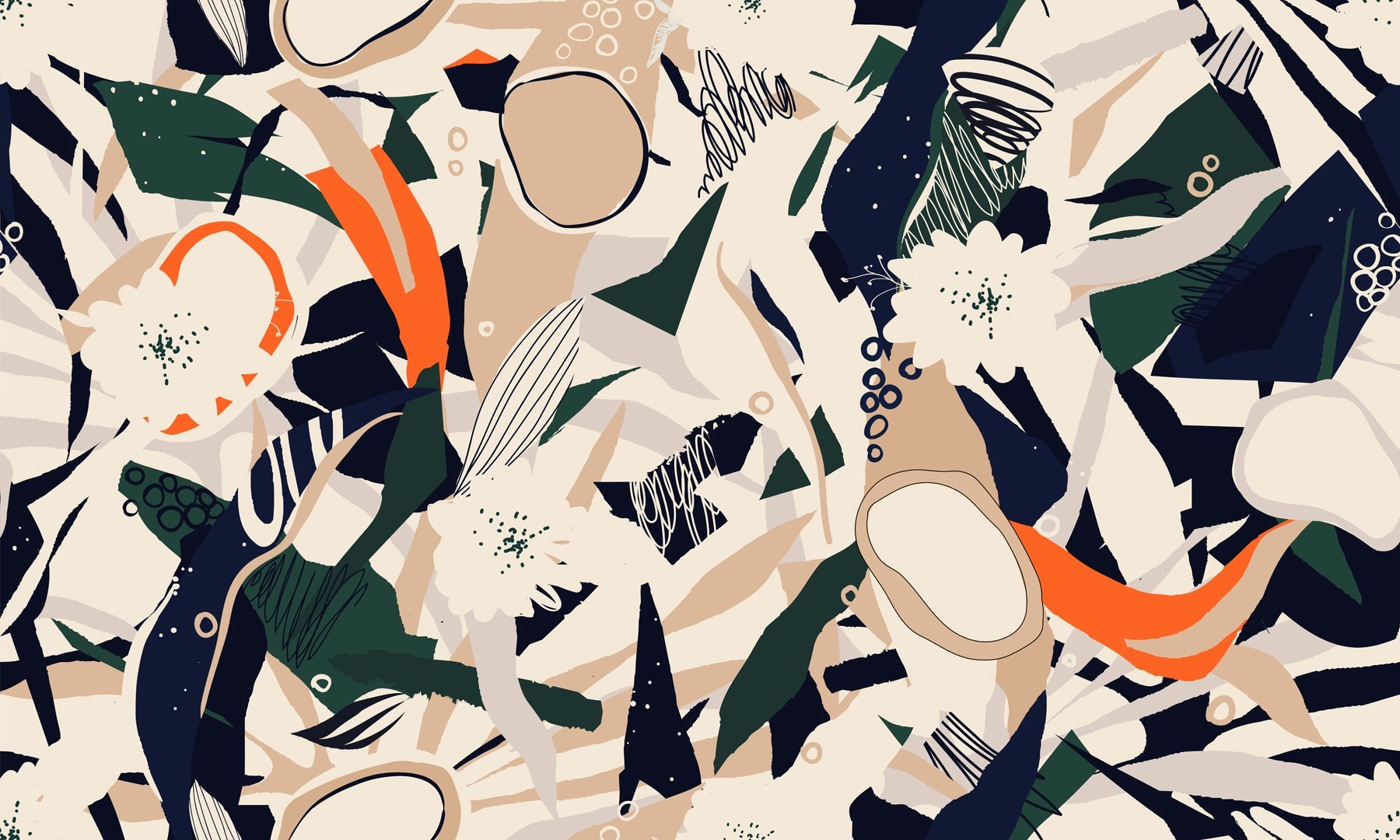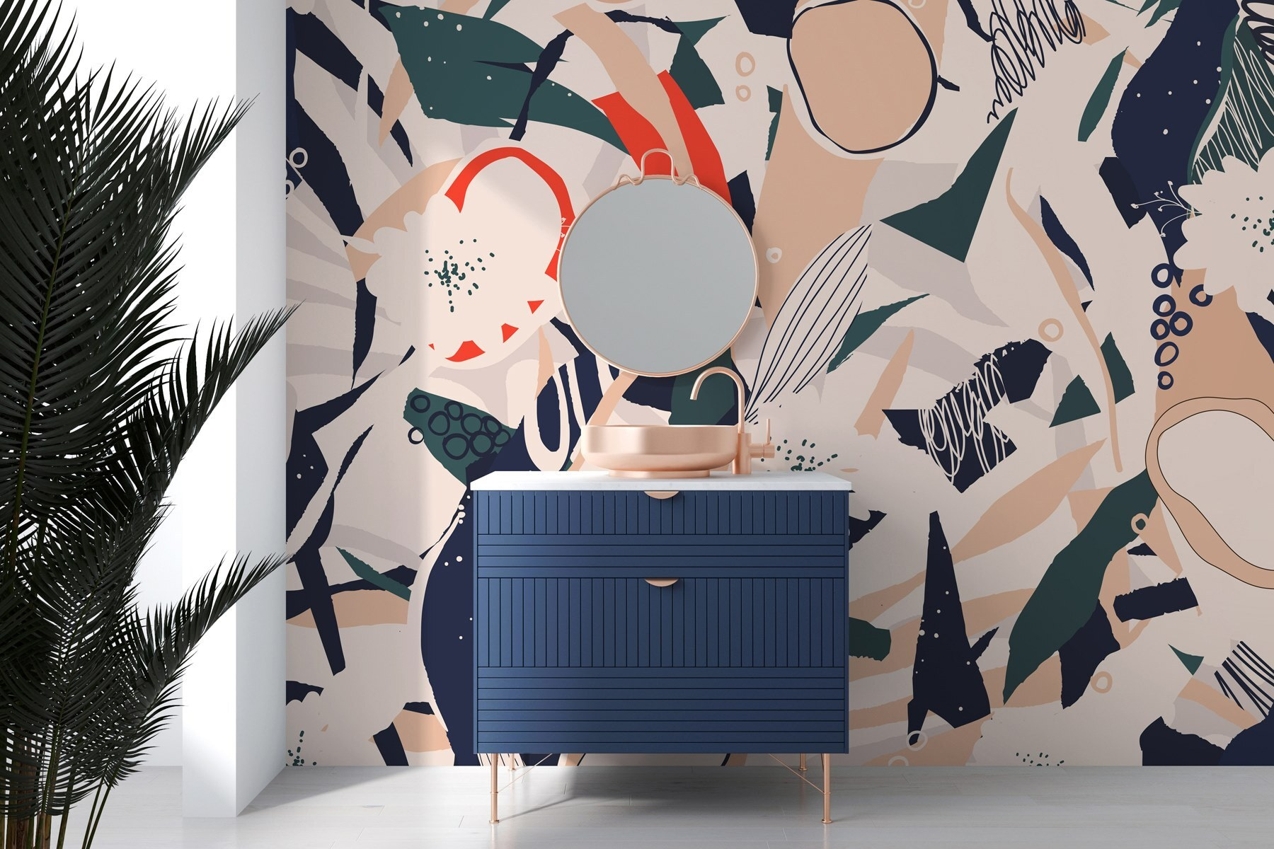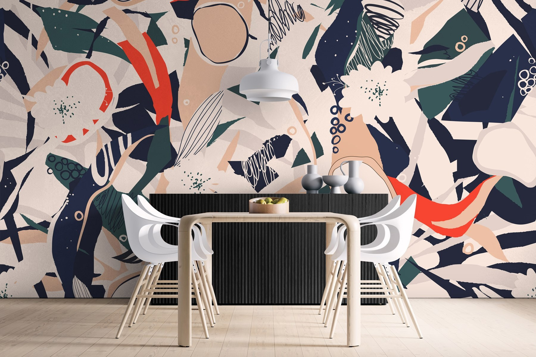 Tover elke kamer om in een levendige oase met deze prachtige muurschildering met een kleurrijk patroon van bloemen en abstracte vormen. Stel je voor dat je je kamer binnenloopt en begroet wordt door uitbarstingen van oranje en rustgevend groen. Het is alsof je een levendige tuin in huis haalt zonder de vervelende pollen! Deze muurschildering is perfect voor een gezellig hoekje of zelfs een levendige eethoek en nodigt uit tot glimlachen en een beetje verwondering. Vrienden zullen vragen of je een geheime botanische tuin hebt. Waarom laat je je muren niet het woord doen? Een speels tintje, toch?