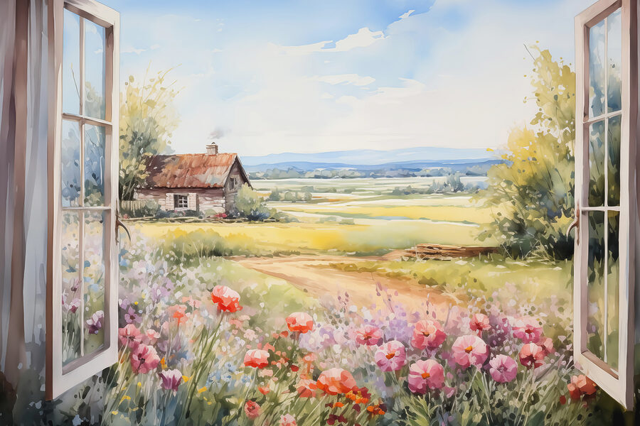 Stel je voor: een luie middag, nippend aan een kopje thee terwijl je naar een fantastisch uitzicht staart – zonder je knusse hoekje te verlaten. Deze muurschildering legt een charmant landschap vast: een schilderachtig huis genesteld tussen levendige bloemen. Het is alsof je een geheim venster opent naar de wonderen der natuur. Voel je je gestrest? Stel je voor dat je verdwaalt in die velden en misschien wel een vlinder of twee ziet. Het is niet alleen decor; het is een deur naar dagdromen. Perfect om vreugde op te wekken, en misschien om te grinniken over hoe je gasten hebt wijsgemaakt dat het een echt raam is!