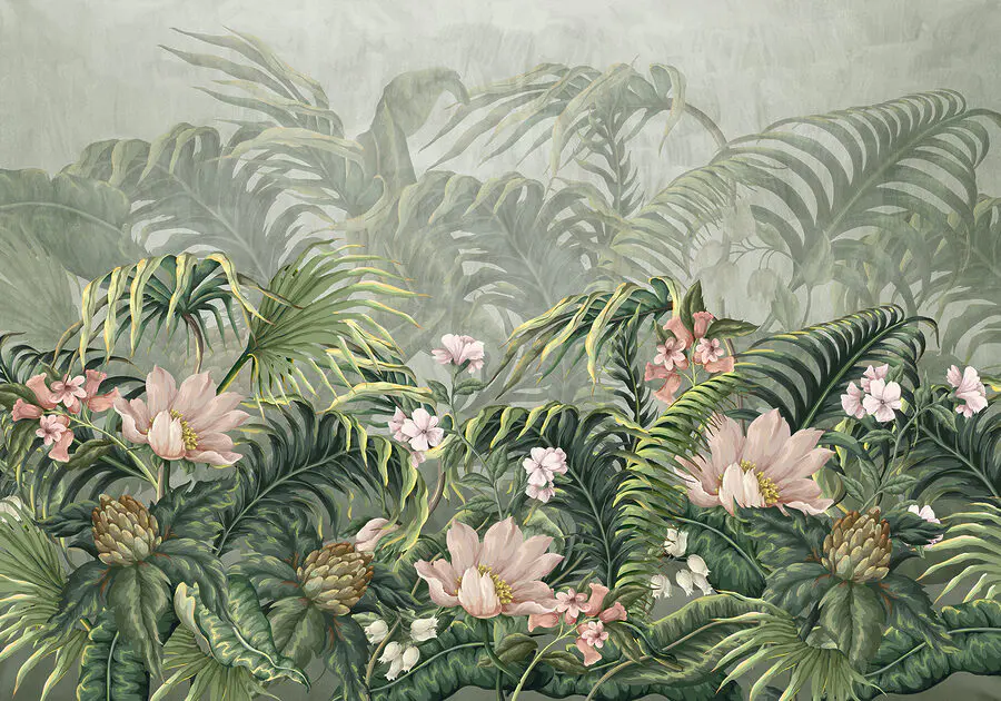 Stel je voor dat je een kamer binnenloopt en het gevoel hebt dat je rechtstreeks naar een weelderige, betoverende jungle bent getransporteerd – best cool, toch? Dat is waar de “Fotobehang w01309” over gaat. Met levendige, gedetailleerde palmbladeren en tropische bloemen brengt deze muurschildering de rustgevende sfeer van de natuur binnenshuis. Stel het je voor in je woonkamer – je ruimte wordt meteen een exotisch toevluchtsoord. Opeens voelt je ochtendkoffie aan alsof je in een tropisch paradijs zit, met fluitende vogels en al! Het is perfect voor iedereen die hunkert naar een vleugje warmte en groen zonder het onderhoud. Of het nu de knalroze bloemen zijn of het diepe groen van de bladeren, dit kunstwerk brengt frisheid en rust in elke omgeving. Het is net het kunstwerk van de natuur zelf – aan je muur!