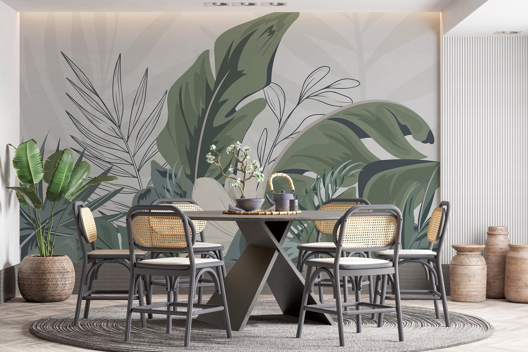 Tover elke ruimte om in een sereen toevluchtsoord met deze prachtige muurschildering, “Natuurlijk gebladerte in harmonie en balans”. Stel je voor dat je elke ochtend een weelderig paradijs binnenstapt, waar levendig groen en zachte texturen je uitnodigen om te ontspannen. Deze muurschildering combineert perfect tropische sferen met een rustgevende esthetiek, waardoor het een fantastische achtergrond is voor rustige avonden of levendige bijeenkomsten. Stel je voor dat je koffie drinkt omringd door de schoonheid van de natuur of dat je vrienden ontvangt in een oase-achtige omgeving. Het is alsof je een stukje van het buitenleven in huis haalt, zonder de insecten! Ideaal voor woonkamers, slaapkamers of zelfs creatieve ruimtes, het zal zeker vreugde en een beetje afgunst opwekken bij gasten. Evenwicht, harmonie en een vleugje natuur – wat wil een mens nog meer?
