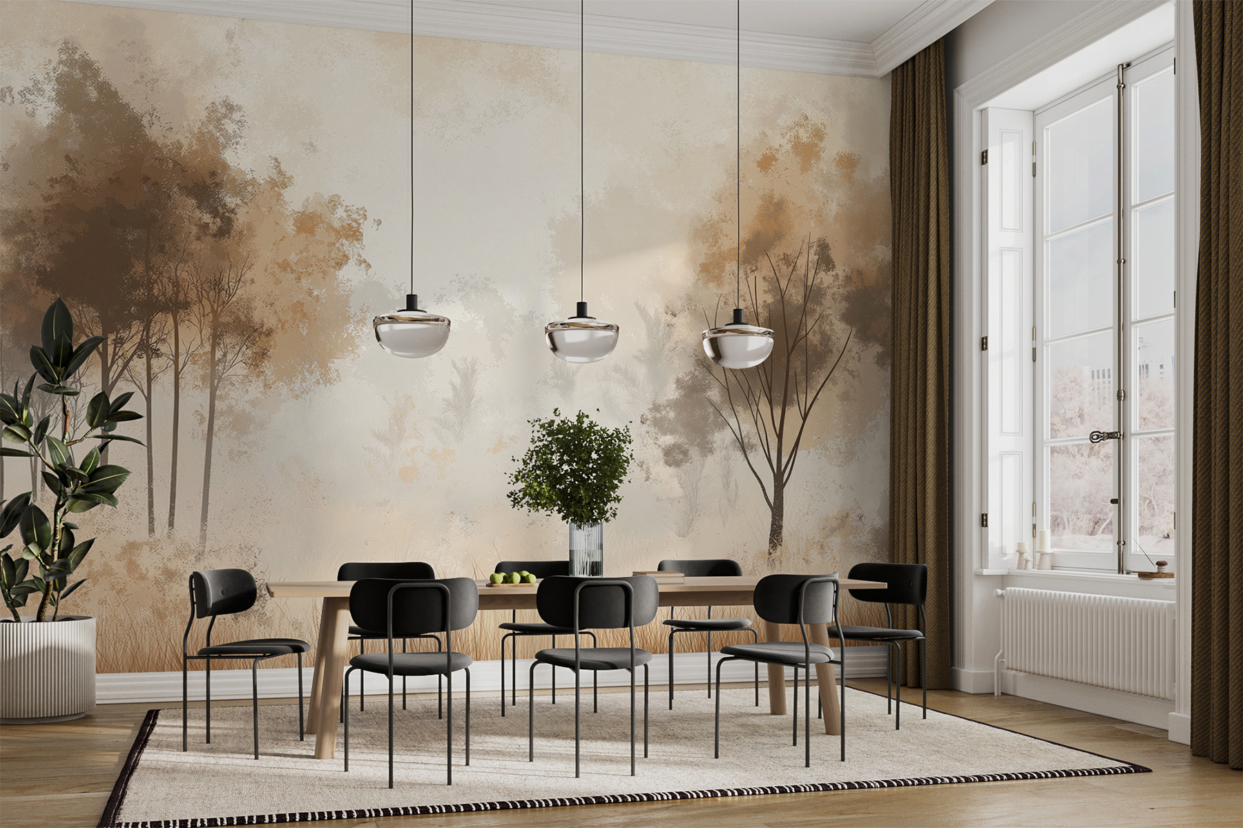 Hier is iets speciaals: een muurschildering van een mistig bos – bomen die zich uitstrekken, mist die zich om hen heen krult, gras dat zachtjes wiegt. Perfect om van elke kamer een fluisterend bosverblijf te maken. Alsof je zo een sprookje binnenstapt, maar dan zonder de pratende dieren (helaas). s Ochtends, met je koffie in de hand, kun je de dauw bijna ruiken. Natuurliefhebbers, je lege muur heeft zojuist zijn roeping gevonden. Stel je voor dat gasten binnenkomen en met open mond zeggen: “Waar is Narnia?”. Het is een sfeer, niet alleen een muurschildering.