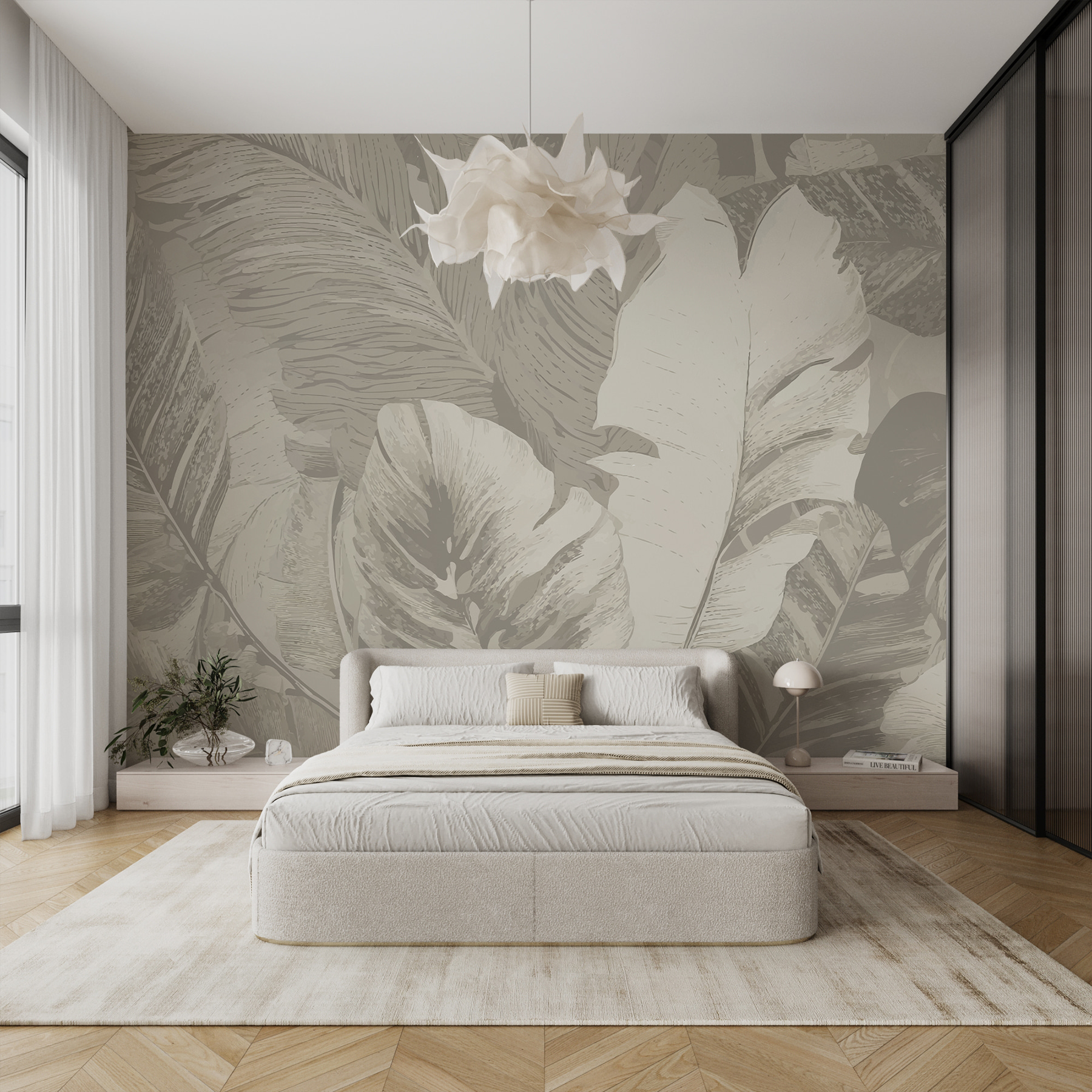 Stel je voor dat je een kamer binnenloopt waar subtiele natuurtinten in een oogwenk rust brengen. Deze muurschildering is als een zacht gefluister uit een tropisch woud, met palmbladeren en junglebomen die verstoppertje spelen in zachte, rustgevende kleuren. Het is bijna een geheime schuilplaats, direct aan je muur. Perfect voor een lui zondagmiddagdutje of gewoon een gezellig praatje met vrienden. De houtachtige texturen voegen een warm tintje toe, waardoor elke ruimte aanvoelt als een sereen toevluchtsoord – zonder de vervelende insecten of vochtigheid! Een vleugje elegantie uit de natuur voor je dagelijkse toevluchtsoord.