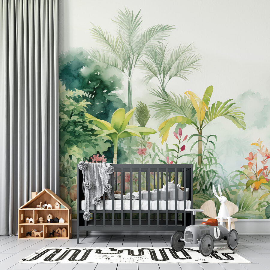 Ooit gewild dat je kamer aanvoelde als een weelderige jungle zonder de vochtigheid of de muggen? Deze muurschildering, boordevol levendige planten en bloemen, brengt de serene sfeer van de natuur naar je kamer. Stel je voor dat je wakker wordt en het gevoel hebt dat je in je eigen tropische paradijs bent – zonder vliegticket. De kleuren zijn zo fris en levendig dat je muren wel eens zouden kunnen inspireren tot spontane dansfeestjes of chill-out sessies. Perfect voor dagdromers, plantenliefhebbers of iedereen die behoefte heeft aan een mini-vakantie thuis.