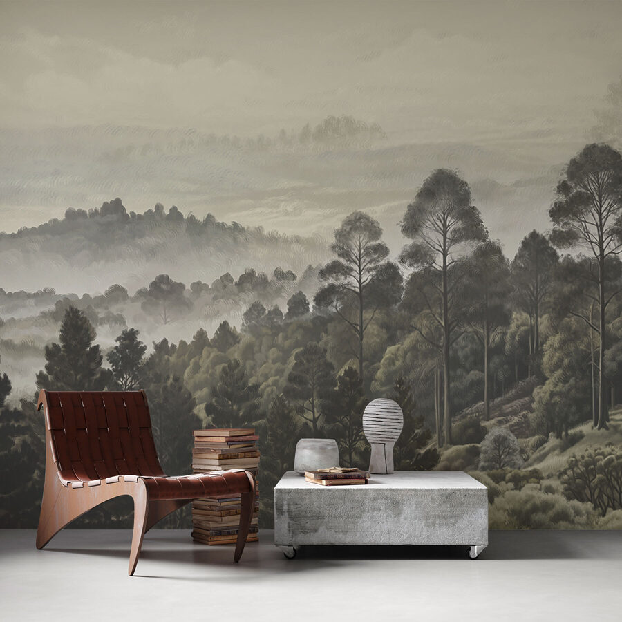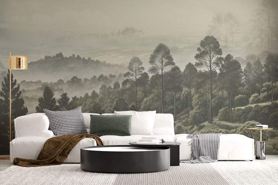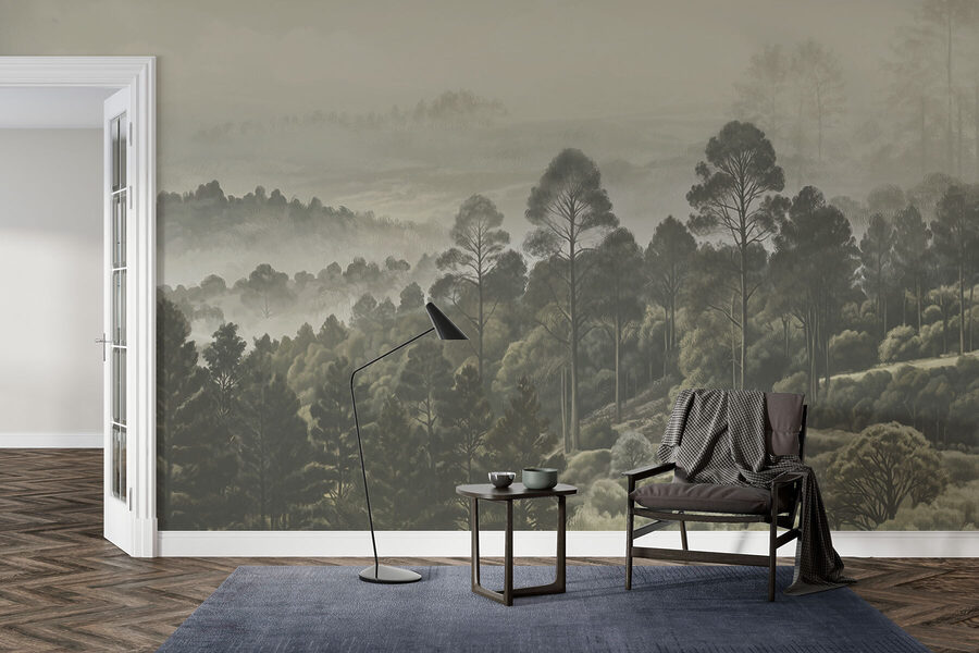 Stel je voor dat je koffie drinkt in je woonkamer, maar in plaats van naar een gewone muur te staren, heb je deze dromerige muurschildering van bomen en mist. Het is alsof je wordt ingepakt in een gezellige, mistige ochtendwandeling door het bos – zonder de insecten natuurlijk. Het gedempte groen en de zachte grijstinten voelen als een zachte omhelzing en creëren de perfecte relaxzone. Je zou zelfs kunnen vergeten dat je binnen bent. Het is niet zomaar een muurschildering; het is een sfeer. Een subtiele ontsnapping zonder ooit je huis te verlaten. Wees alleen niet verbaasd als je gasten wat langer blijven hangen!