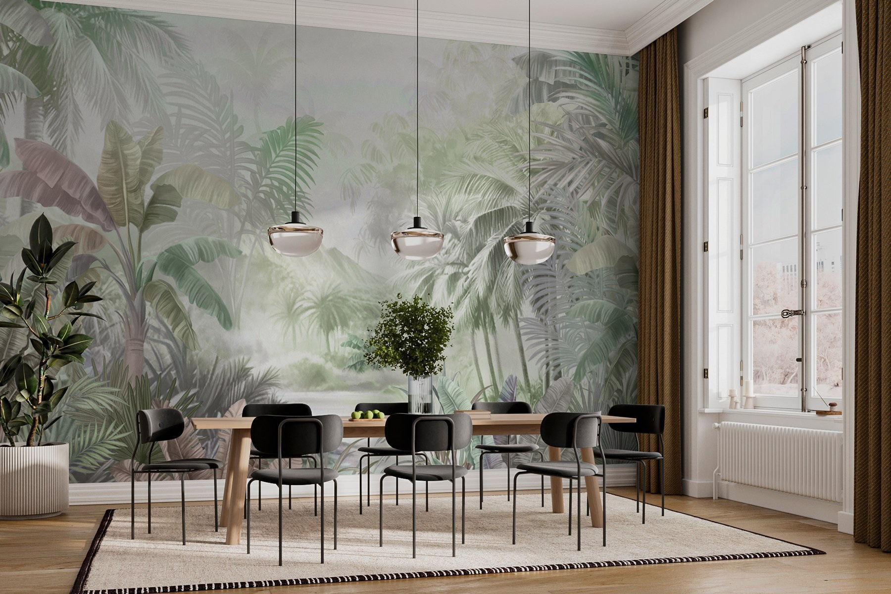 Tover je kamer om in een tropisch paradijs met deze betoverende bosschildering. Stel je voor dat je je kamer binnenloopt en meteen de kalme sfeer van een serene jungle voelt – weelderig groen fluistert verhalen van avontuur en rust. De zachte tinten en delicate details geven het een dromerige sfeer, perfect voor die momenten waarop je even wilt ontsnappen aan de alledaagse drukte. Of je nu koffie drinkt of in een goed boek verzonken bent, deze muurschildering nodigt uit tot verwondering. Het is alsof je de natuur aan je muur hebt, zonder de muggen. Haal dit stuk in huis en zie hoe je ruimte opbloeit!