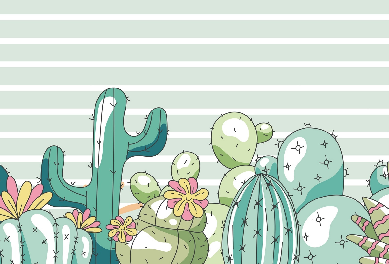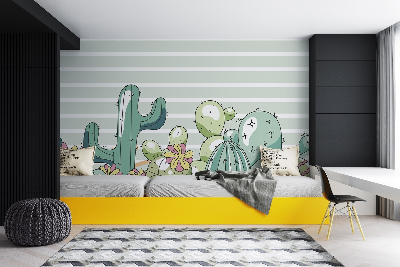 Tover elke kamer om in een speelse oase met deze prachtige muurschildering met een levendige groep cactussen versierd met vrolijke bloemen. Stel je voor dat je een ruimte binnenstapt waar deze eigenzinnige planten een gevoel van warmte en plezier brengen, alsof je een mini woestijnfeestje op je muur hebt. De zachte, rustgevende strepen op de achtergrond vormen een zacht evenwicht met de levendige kleuren van de cactussen, waardoor het perfect is voor een kinderkamer of een gezellig leeshoekje. Het is net een geheimpje van de natuur, dat uitnodigt tot glimlachen en de verbeelding prikkelt. Stel je eens voor hoe kinderen zich oprollen met een boek onder deze betoverende muurschildering, of dagdromen over hun volgende avontuur in een magische tuin.