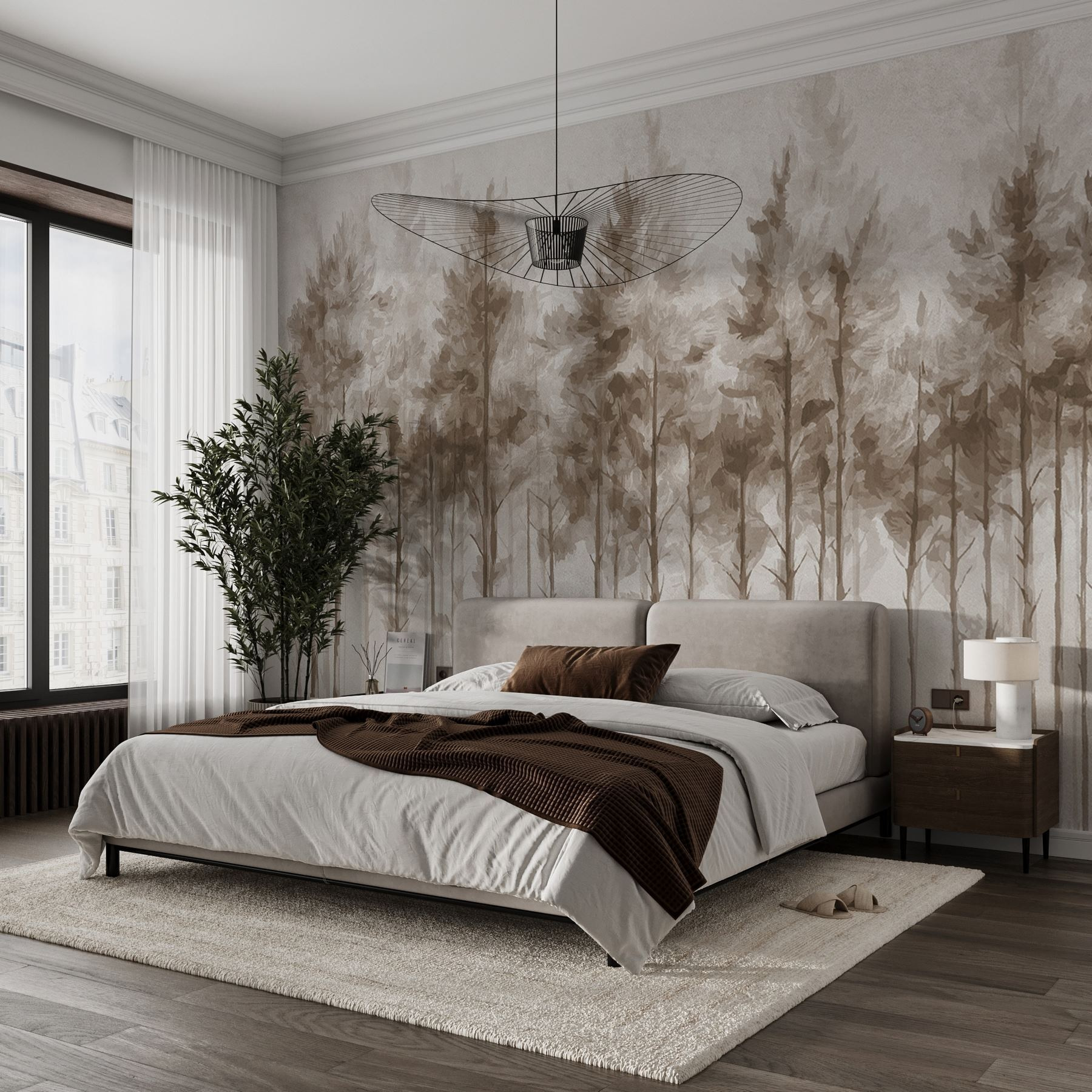 Stel je voor dat je een gezellige ruimte binnenstapt en begroet wordt door de zachte aanwezigheid van een bos. Deze muurschildering “Groep bomen in een bos” verandert elke kamer in een serene ontsnapping. De zachte, aardse tinten roepen kalmte op, alsof je thee drinkt in een toevluchtsoord in het bos. Zie het voor je achter je favoriete leesstoel, uitnodigend voor luie middagen vol avonturen uit verhalenboeken. De delicate berkenbomen staan rechtop en fluisteren geheimen van de schoonheid van de natuur. Het is alsof je een rustig kampvuur in huis hebt – marshmallows zijn niet nodig, alleen een gevoel van vrede. Perfect voor wie houdt van een vleugje natuur zonder de insecten, toch?