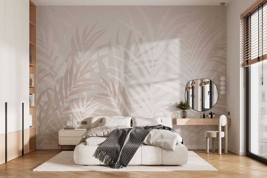 Breng een vleugje tropen in huis met deze prachtige muurschildering met elegante witte en bruine bladeren. Stel je eens voor dat je een kamer binnenstapt waar de buitenlucht je omarmt – het is alsof je telkens als je binnenstapt een zacht gefluister van de natuur hoort. Deze muurschildering voegt een sfeer toe die zowel rustgevend als een beetje avontuurlijk is, perfect voor woonkamers of gezellige leeshoekjes.