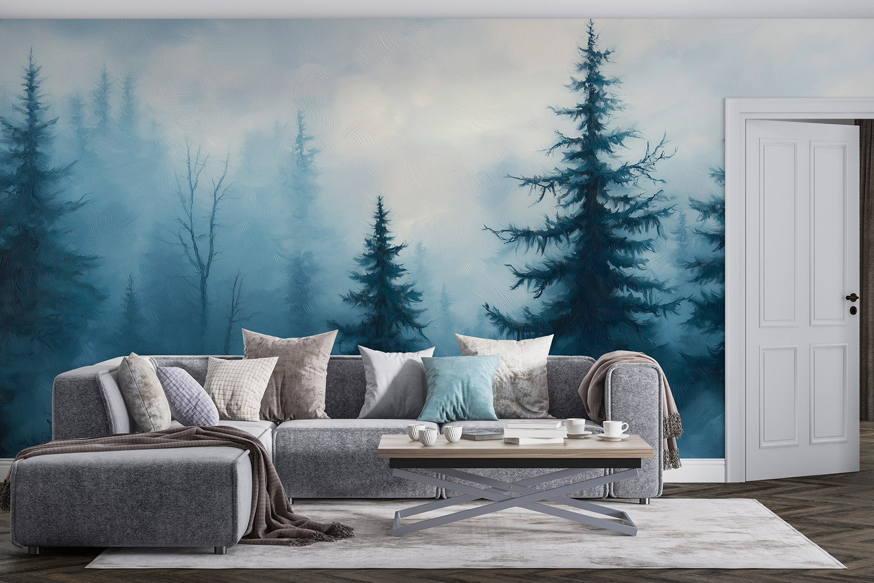 Transformeer je ruimte met de betoverende charme van de muurschildering “Mistig bos met bomen”. Stel je voor dat je een mistig bos binnenstapt waar elke blik voelt als een zachte ontsnapping naar de natuur. De zachte, gedempte kleuren hullen je kamer in een rustgevende sfeer – perfect voor een gezellige leeshoek of een serene slaapkamer.