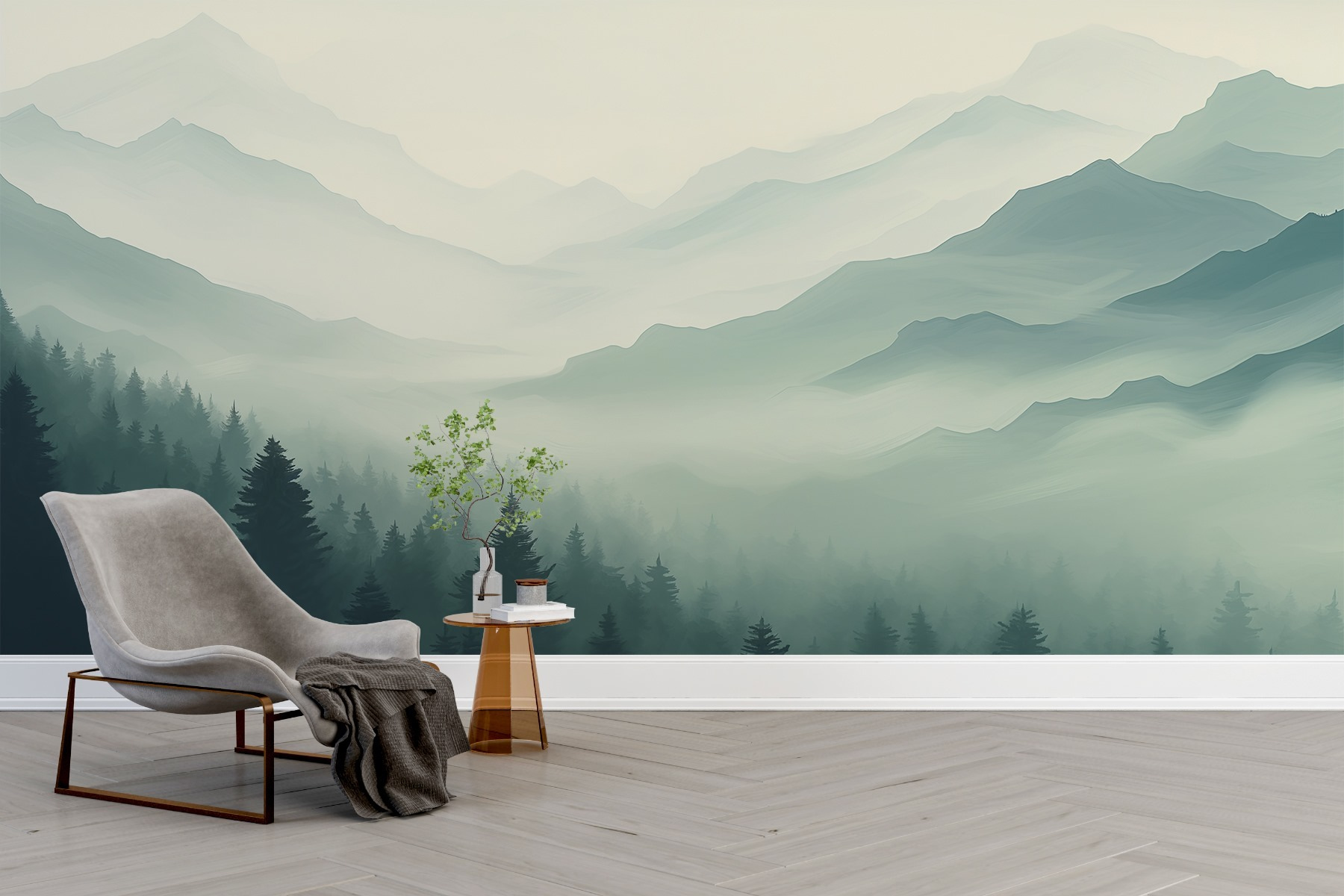 Transformeer je ruimte met deze betoverende muurschildering met een mistig berglandschap dat wordt gekust door zachte bomen. Stel je voor dat je wakker wordt met de kalme tinten van de bergen, alsof het gefluister van de natuur elke dag begroet. De zachte mist omhult de toppen en creëert een bijna dromerige achtergrond – perfect voor gezellige ochtenden of rustige avonden met een kopje thee.