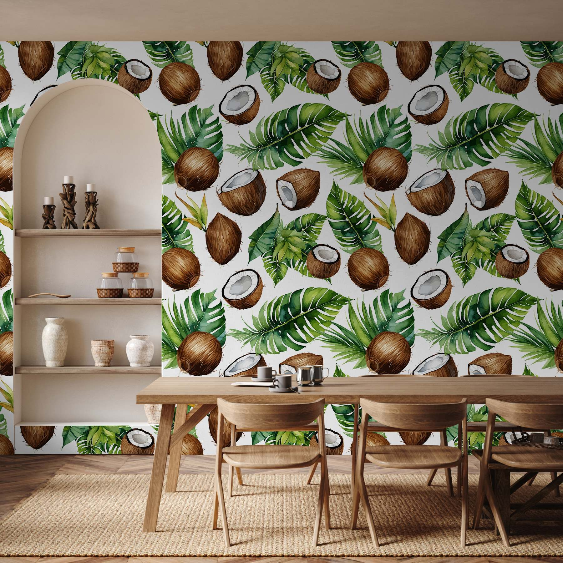 Verander een effen muur in een tropisch paradijs met deze levendige muurschildering met speelse kokosnoten en weelderige bladeren. Het is alsof je een stukje jungle in huis haalt. Stel je voor dat je wakker wordt met dit vrolijke patroon – het is bijna elke dag een mini-vakantie! De aardetinten mixen perfect met de levendige groentinten en zorgen voor een instant mood-lifter. Perfect voor een gezellige leeshoek of een levendige keuken, deze muurschildering decoreert niet alleen maar vertelt ook een verhaal. Plus, wie zou zich niet een beetje meer ontspannen voelen, misschien zelfs op slippers, als je omringd bent door zulke uitnodigende vibes? Laat je muren leven en charme uitstralen.