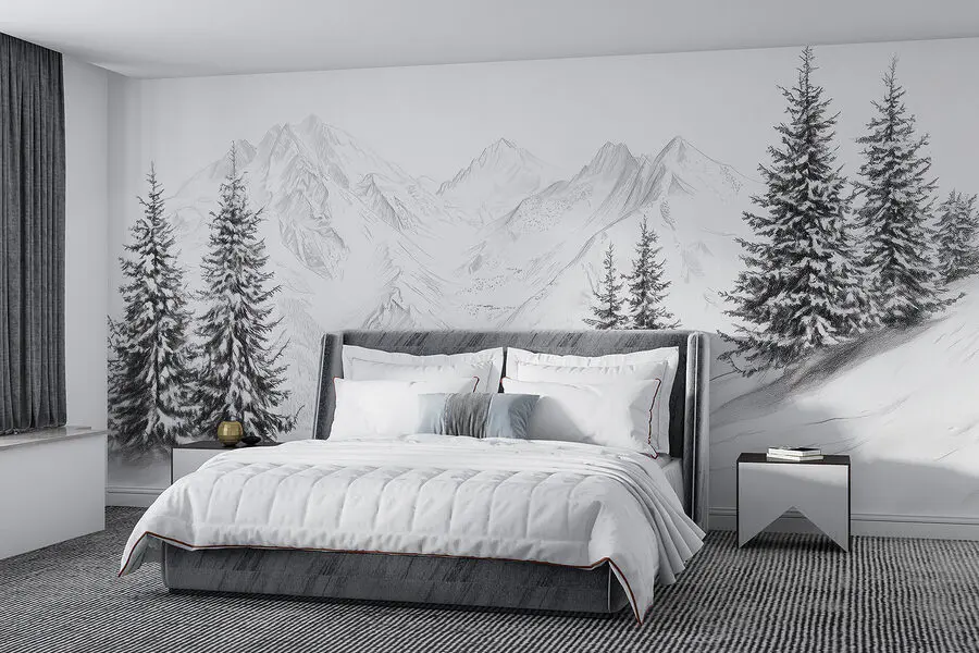 Verander elke kamer in een serene ontsnapping met deze prachtige muurschildering van een besneeuwde bergketen. Stel jezelf voor, starend naar die majestueuze pieken terwijl je lekker knus een kopje chocolademelk drinkt – perfect om de verbeelding te stimuleren of een dagdroom te stimuleren. De ingewikkelde details en zachte tinten brengen een gevoel van kalmte en verwondering, als een zacht gefluister van de natuur bij je thuis. Het is niet zomaar decoratie; het is een ticket naar rust. Of het nu een woonkamer, slaapkamer of kantoor is, deze muurschildering nodigt uit tot rust en creativiteit. Stel je voor – elke muur kan een verhaal vertellen – een knus winterverblijf wacht op je!