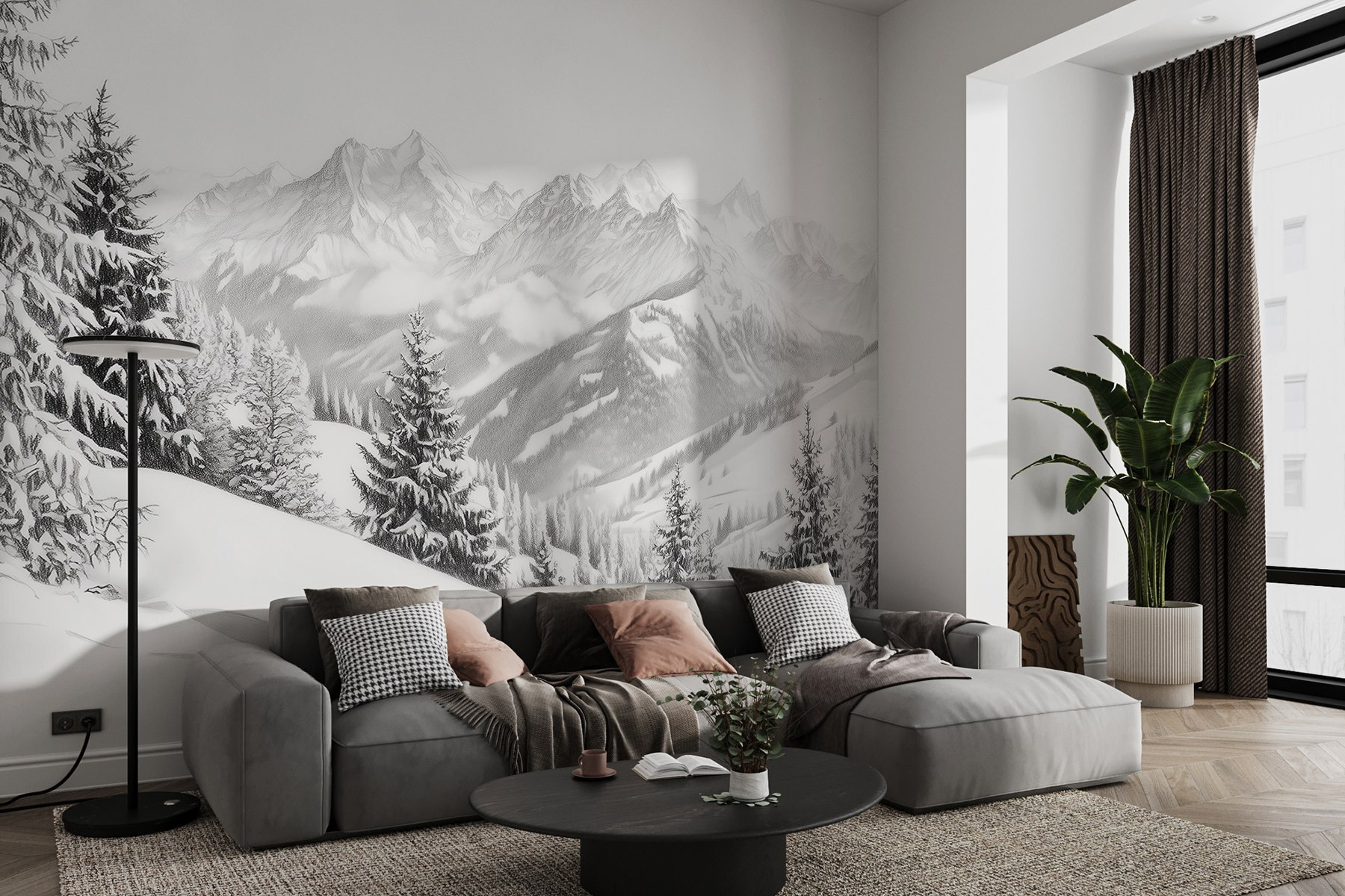 Tover elke kamer om in een serene winter met deze prachtige muurschildering van besneeuwde bergen en majestueuze bomen. Zie jezelf al zitten met een warm drankje, starend naar het adembenemende landschap dat op een steenworp afstand ligt. De rustige witte en zachtgrijze tinten roepen een kalmte op die je omhult als een warme deken – perfect voor kille nachten. Voeg een vleugje wildernis toe aan je muren en laat je ruimte frisse berglucht ademen. Deze muurschildering is ideaal voor natuurliefhebbers en dagdromers en nodigt uit tot vredige gedachten en een gevoel van avontuur, zelfs vanaf de bank.