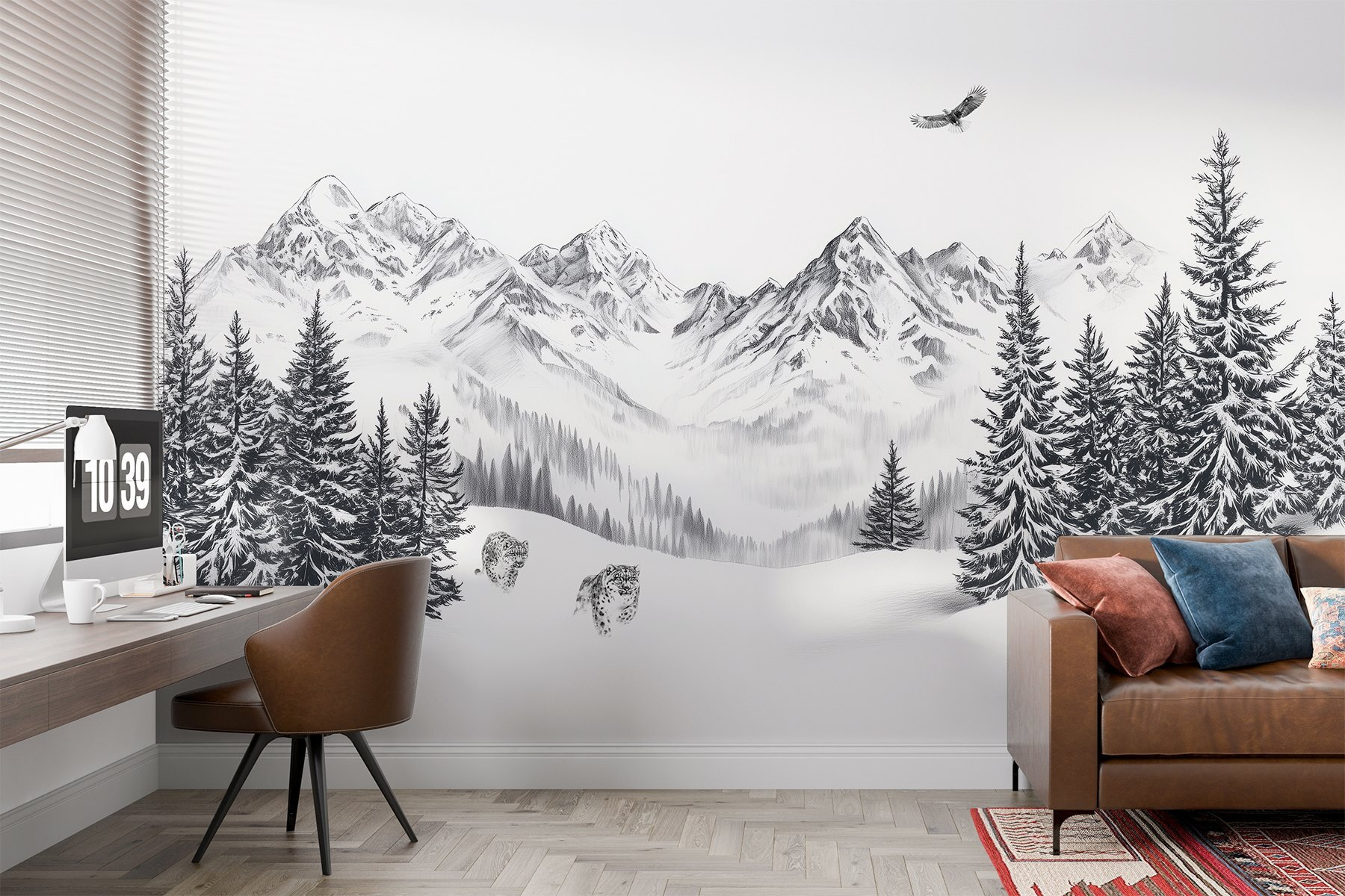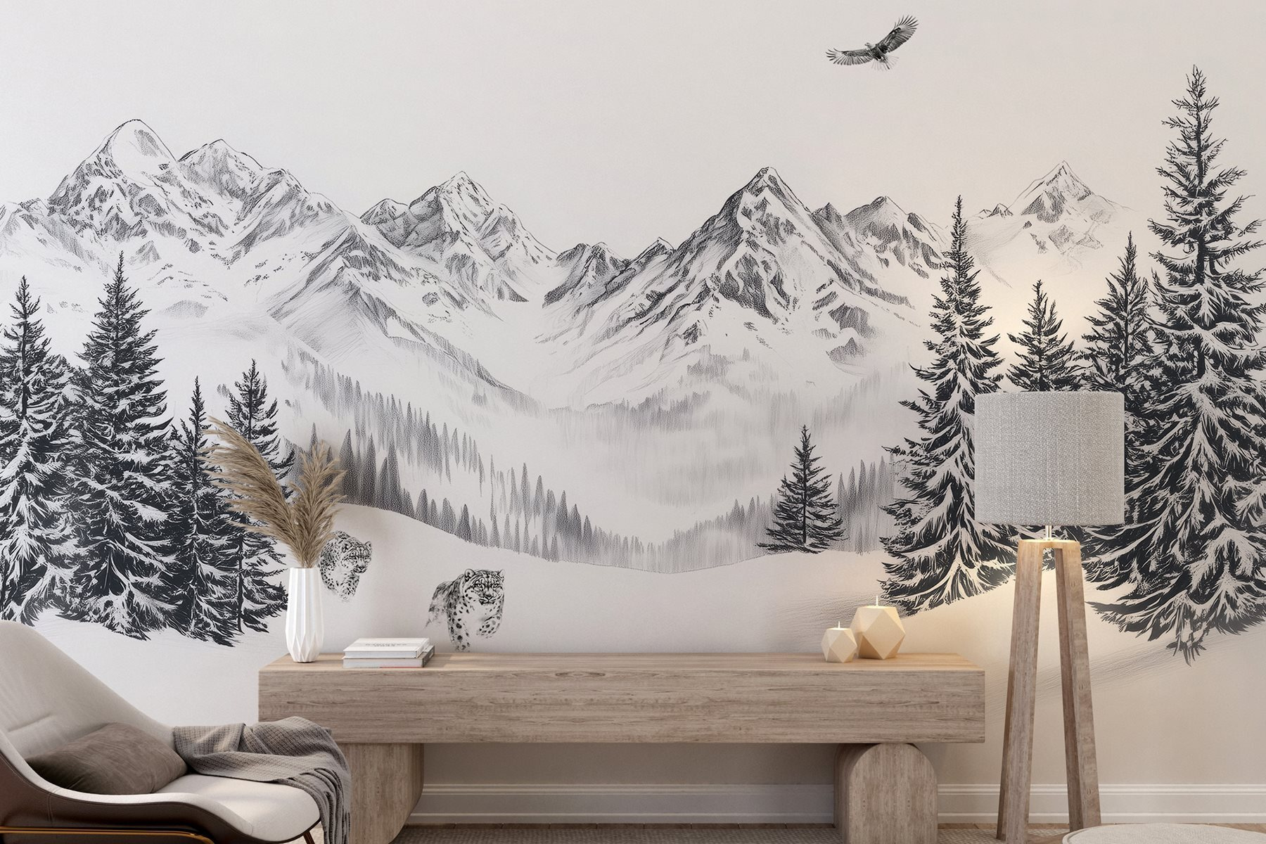 Tover elke muur om in een sereen toevluchtsoord met deze prachtige muurschildering van besneeuwd berglandschap. Stel je de zachte stilte voor van vallende sneeuw terwijl majestueuze bergen oprijzen in de wolken terwijl een eenzame vogel overvliegt. Het is alsof je een vredig stukje natuur in huis haalt. Stel je voor dat je ‘s ochtends aan je koffie nipt, naar deze schoonheid staart en een golf van kalmte over je heen voelt komen. Deze muurschildering is perfect voor gezellige hoekjes of opvallende muren en geeft niet alleen karakter, maar nodigt ook uit tot dagdromen over besneeuwde wandelingen en frisse berglucht. Bovendien, wie wil er nu niet een paar brutale luipaarden in de buurt? Het is een gespreksstarter en een ontsnapping, alles in één!