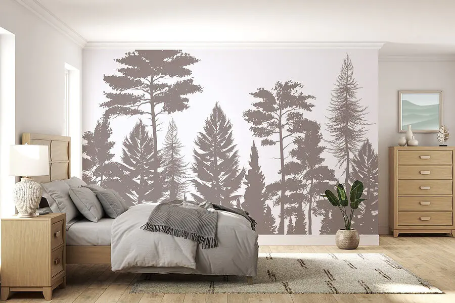 Transformeer je ruimte met deze prachtige muurschildering van een bos vol bomen, perfect voor iedereen die hunkert naar een stukje natuur binnenshuis. Stel je voor dat je je gezellige woonkamer binnenstapt en het gevoel hebt dat je door een rustig bosje wandelt, met zachte schaduwen en serene silhouetten die uitnodigen tot kalmte. De aardse tinten creëren een warme achtergrond, waardoor andere decorstukken tot hun recht komen zonder de zintuigen te overweldigen. Het is alsof je een frisse wind door je huis laat waaien. Vrienden vragen zich misschien af of je een geheime hut in het bos hebt. Perfect voor natuurliefhebbers of iedereen die even wil ontsnappen aan de alledaagse drukte!