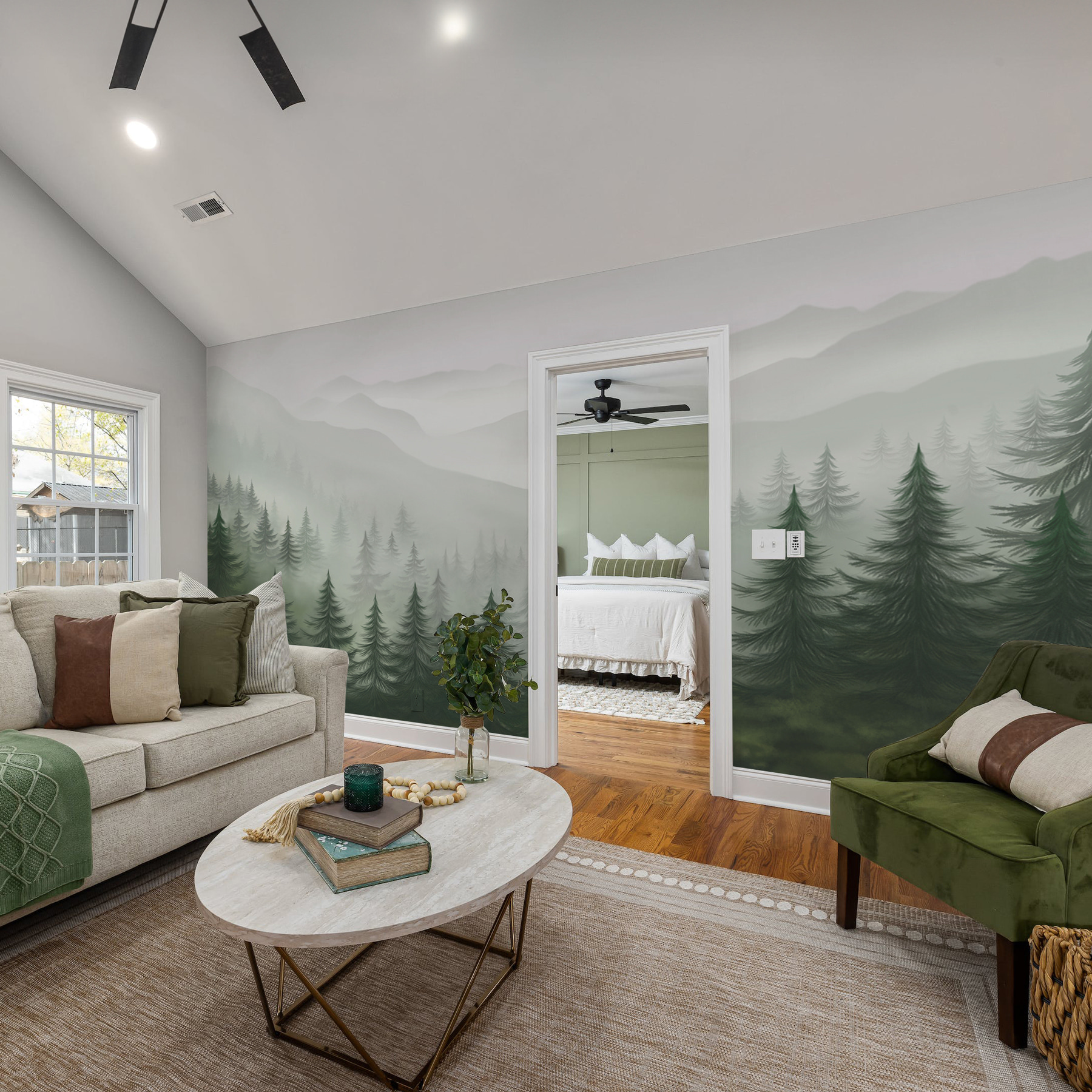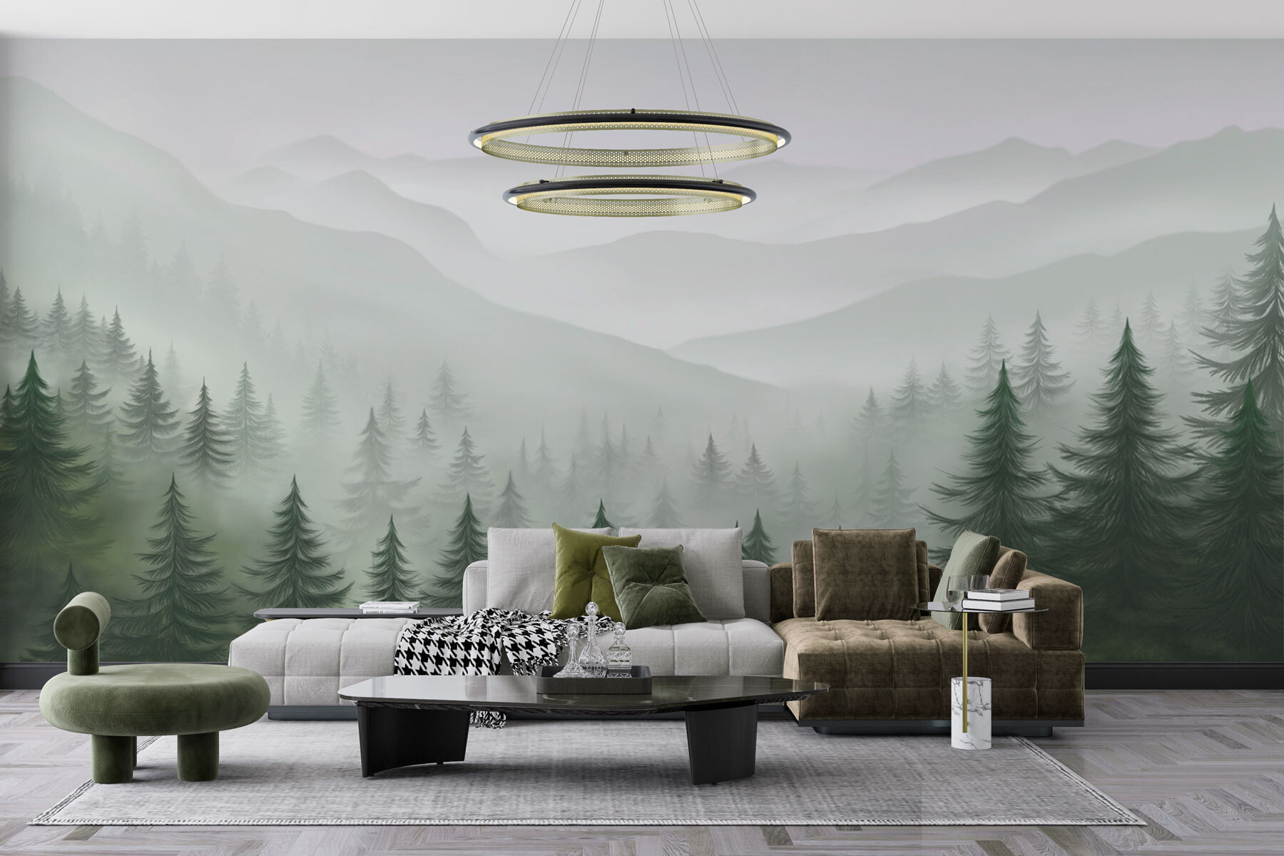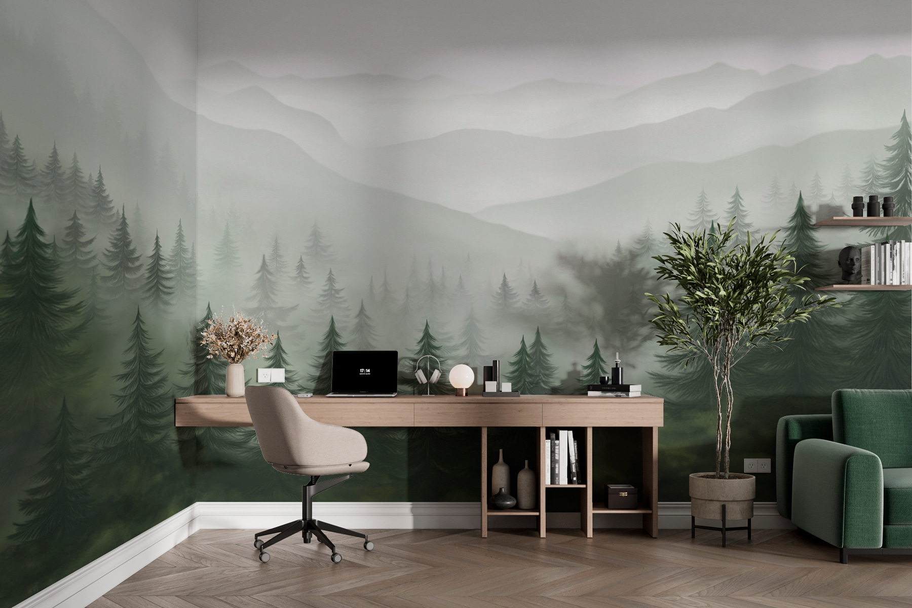 Verander elke kamer in een serene ontsnapping met deze prachtige muurschildering “Mistig landschap met bomen en bergen”. Stel je voor dat je lekker knus een kopje thee gaat drinken, omringd door de zachte omhelzing van torenhoge dennenbomen en mistige bergen. Het is alsof je een dromerig bos binnenstapt, zonder de insecten en modderige schoenen. De zachte groen- en grijstinten creëren een rustgevende sfeer, waardoor het perfect is voor een chille leeshoek of een rustgevende slaapkamer. Het fluistert: “Haal diep adem en ontspan.” En wie heeft daar geen behoefte aan? Of het nu een gespreksstarter is of een vredige achtergrond, deze muurschildering voegt een vleugje natuur toe aan je muren.