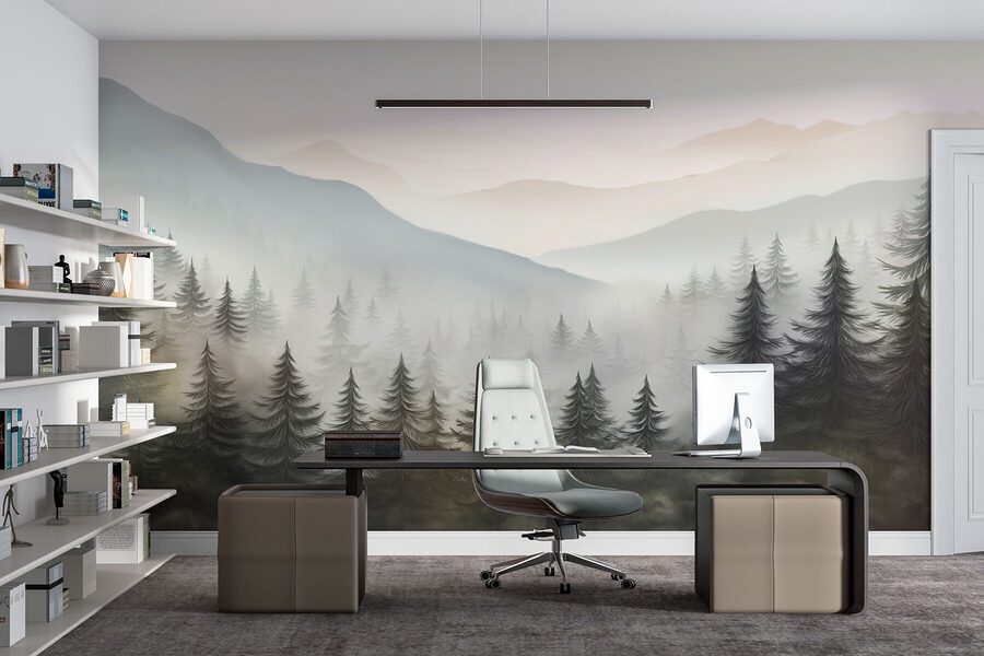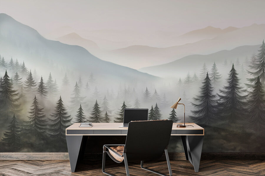 Stel je voor dat je een sereen bos binnenstapt, waar mist rond torenhoge bomen danst en bergen zachtjes opdoemen in de verte. Deze muurschildering, “Mistig landschap met bomen en bergen”, brengt die dromerige ontsnapping bij je thuis. De muurschildering is perfect voor een gezellige leeshoek of een zen-slaapkamer en nodigt uit tot rust. Stel je voor dat je hier tot rust komt na een lange dag, misschien met een kopje thee, terwijl de natuur zoete woordjes fluistert door de mist. De zachte tinten voegen een vleugje elegantie toe, waardoor je ruimte aanvoelt als een stukje paradijs. Met deze muurschildering zijn je muren in een handomdraai omgetoverd tot een rustig toevluchtsoord!