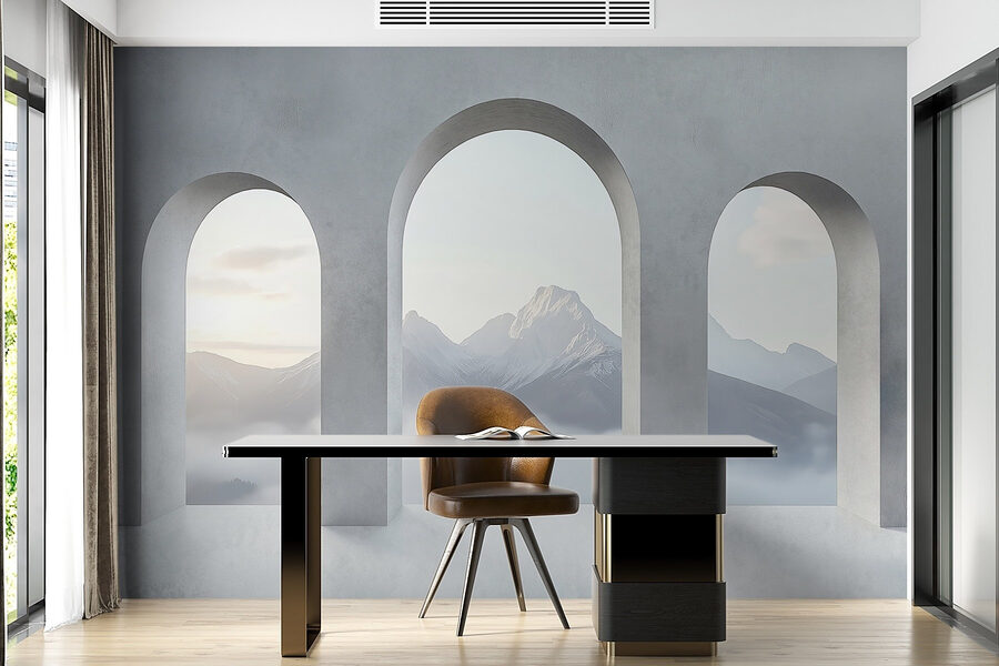 Transformeer elke ruimte met deze prachtige muurschildering die aanvoelt als een gezellige vlucht in de natuur. Stel je voor dat je wakker wordt met een kop koffie in je hand, terwijl je door elegante boogramen naar majestueuze bergen kijkt, zachtjes gehuld in mist. Het is alsof je de rust van het buitenleven naar je woonkamer brengt – zonder dat je wandelschoenen nodig hebt! Of het nu gaat om een rustig leeshoekje of een open loungehoek, deze muurschildering zorgt voor een frisse wind. Dus waarom laat je de bergen niet inspireren tot dagdromen en vredige momenten? Het is de natuur op zijn mooist – zonnebrandcrème is niet nodig!