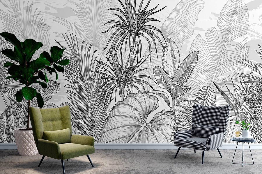Transformeer je kamer met deze prachtige zwart-witte muurschildering met de complexe schoonheid van tropische planten. Stel je voor dat je een serene jungle binnenstapt telkens als je de kamer binnenkomt. Die bladerrijke contouren zijn als een stijlvolle geheime tuin die bij elke inrichting past – perfect voor het creëren van een gezellige leeshoek of een levendige eethoek. Het contrast van gedurfde vormen tegen een zachte achtergrond nodigt uit tot speelse verbeelding. Laat de zachte schoonheid van de natuur je inspireren tot ontspanning, en wie weet? Misschien denken je vrienden wel dat je een mini-regenwoud in huis hebt.