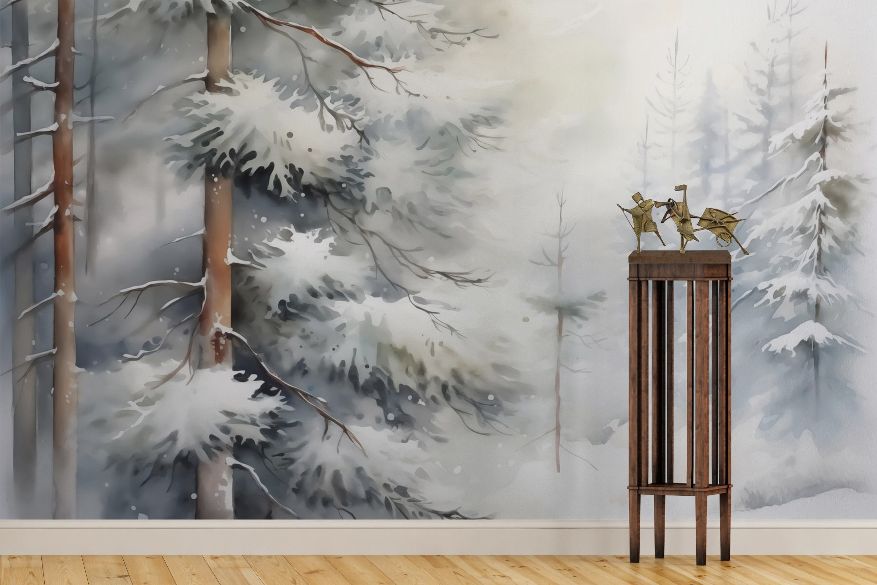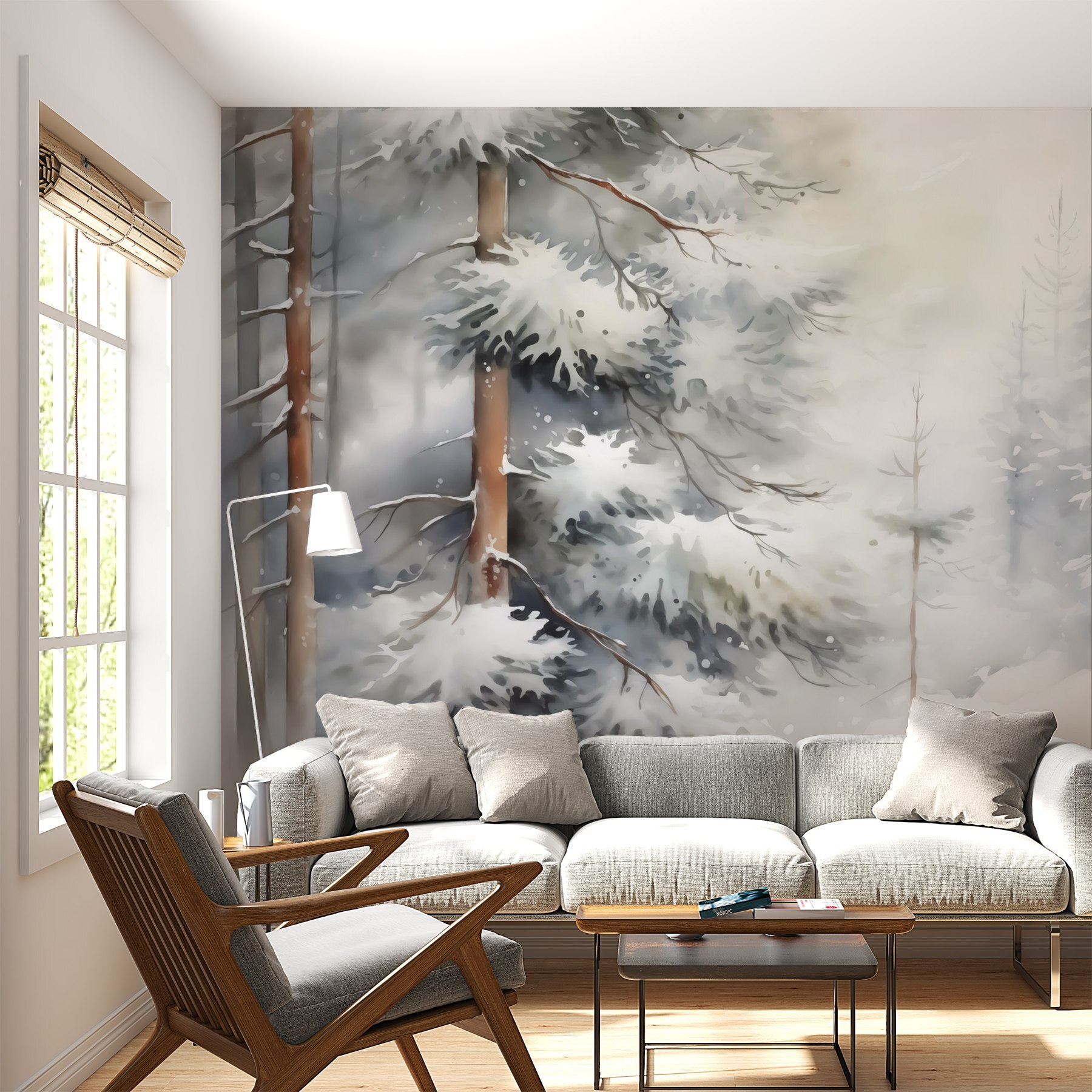 Stelt u zich eens voor dat u een sereen winterlandschap binnenstapt telkens wanneer u uw ruimte betreedt. Deze muurschildering van besneeuwde bomen brengt die uitnodigende kilte rechtstreeks naar je muren, perfect voor wie houdt van de stille schoonheid van de natuur. De zachte tinten en zachte tinten wit en grijs creëren een rustgevende sfeer, waardoor het voelt als een warme kop chocolademelk op een besneeuwde dag. Het is alsof je een dennenboom knuffelt, maar dan zonder de kou! Perfect voor een woonkamer of een knus hoekje, het zal je doen glimlachen en warmte brengen op kille avonden. Tover je huis om in een toevluchtsoord in het bos – sneeuwlaarzen zijn niet nodig!