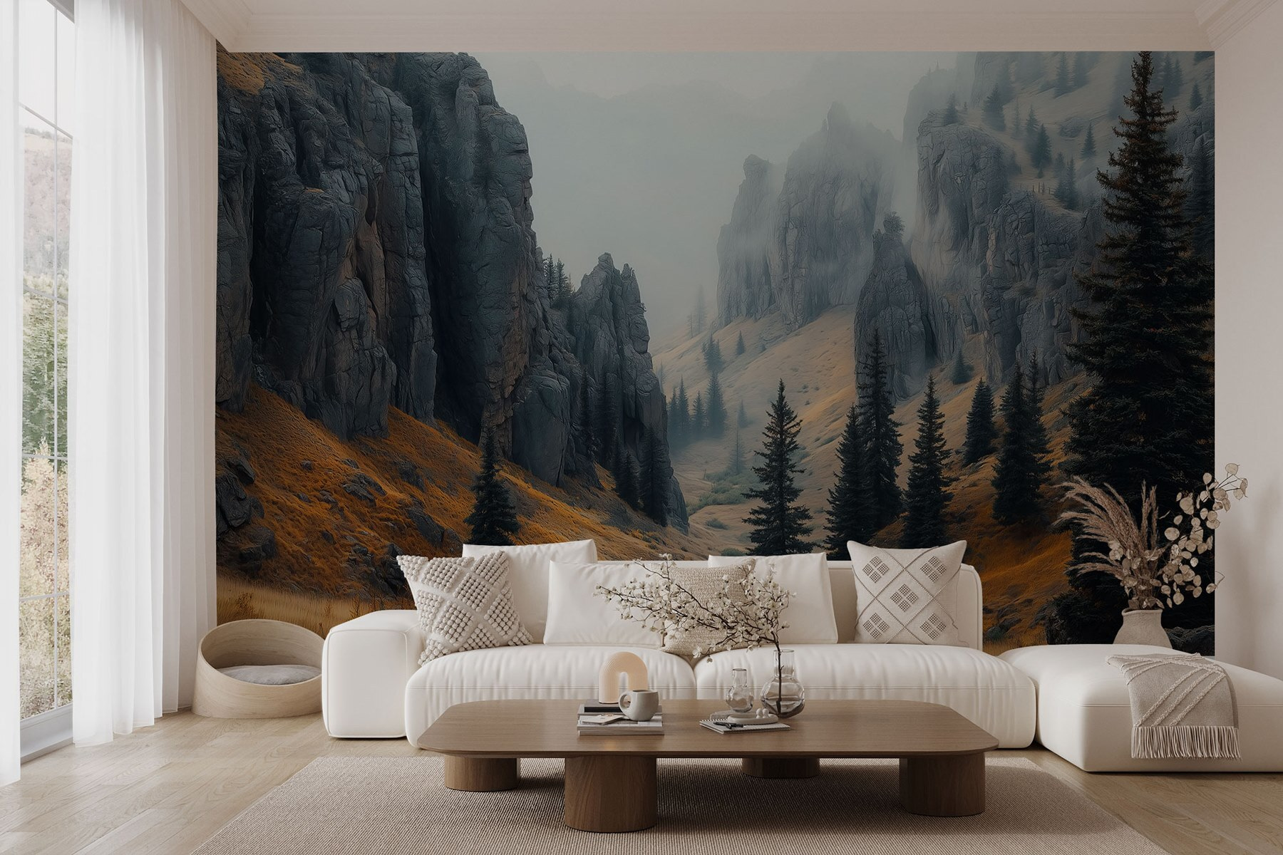 Tover elke kamer om in een gezellig toevluchtsoord in de bergen met deze prachtige muurschildering van rotsachtige bergen gehuld in zachte mist. Stel je voor dat je wakker wordt met dit serene landschap in plaats van een lege muur – over een sfeerbooster gesproken! Het diepe groen van de bomen steekt af tegen de aardetinten, waardoor een vleugje natuur je kamer binnenkomt. Het is perfect voor wie ervan droomt om naar de natuur te ontsnappen, maar toch graag thuis een warme kop koffie drinkt. Stel je voor: Zondagochtenden nippend aan dat brouwsel terwijl de kinderen forten bouwen – dat is pas een herinnering in de maak! Plus, mistige berglucht? Zo sfeervol. Of het nu een woonkamer, kantoor of zelfs een meditatiehoekje is, deze muurschildering heeft de perfecte mix van avontuur en rust. Het is als frisse berglucht inademen zonder de wandelschoenen. Dus waarom niet een kleine reis maken zonder van de bank af te komen?