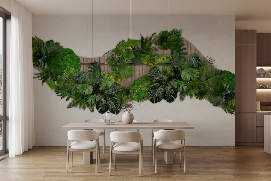 Verander je ruimte in een weelderige oase met deze prachtige muurschildering met een levendige groep groene bladeren op een rustiek houten oppervlak. Stel je voor dat je een kamer binnenloopt die aanvoelt als een buitenparadijs – je zou zelfs vogels kunnen horen fluiten (oké, misschien alleen in je hoofd). Deze muurschildering brengt de tropische sfeer naar je muren, en wie houdt er niet van een beetje op de natuur geïnspireerde decoratie?
