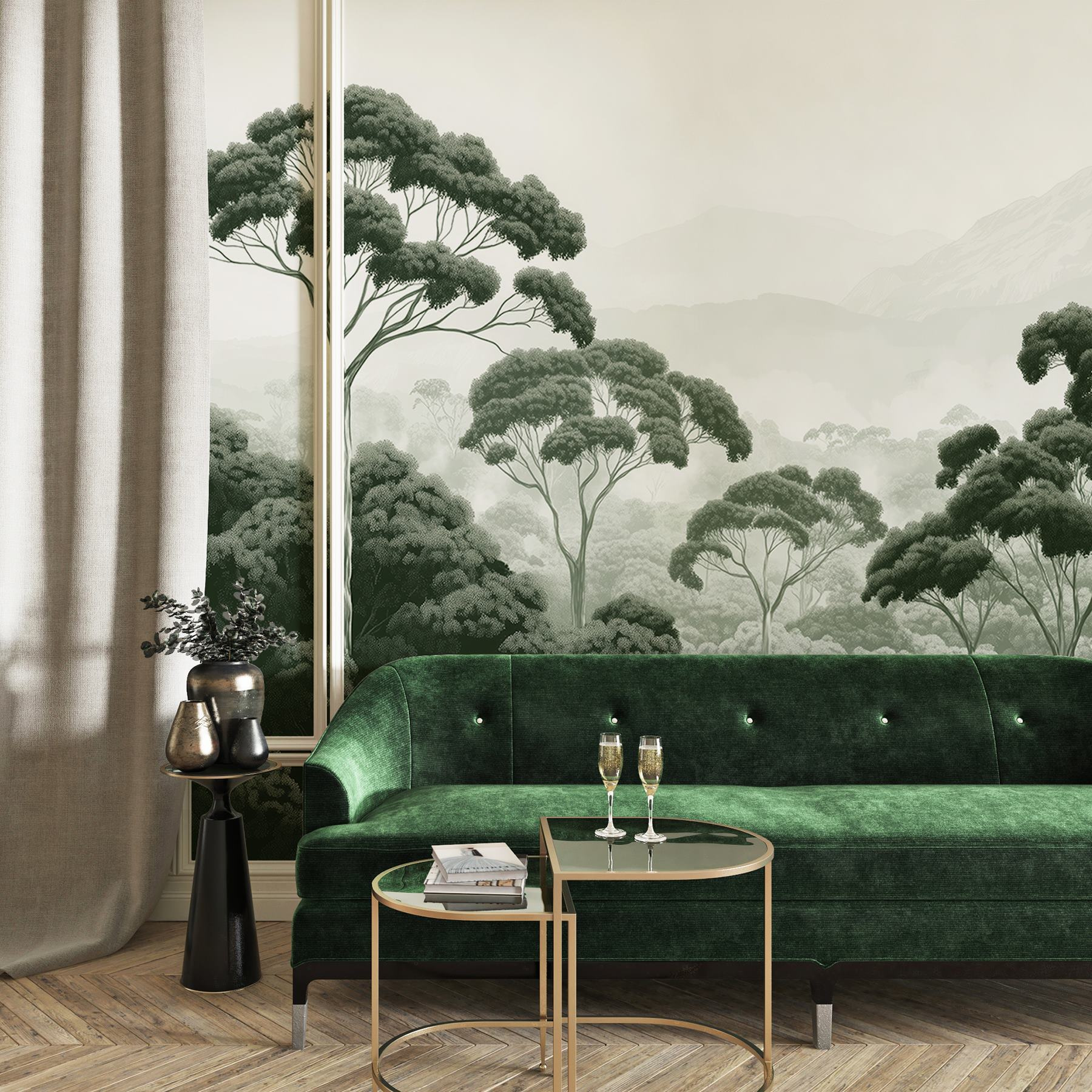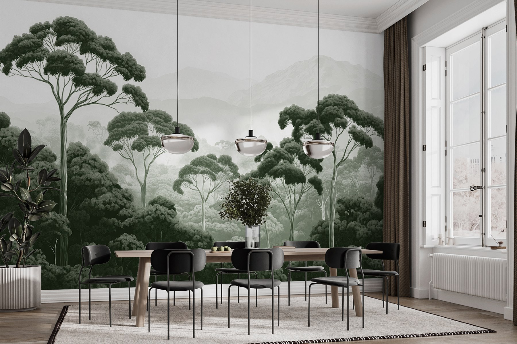 Stap in een rustige ontsnapping met deze prachtige muurschildering met een serene bosgezicht. Stel je het zachte geritsel van bladeren en het gefluister van een briesje voor terwijl je je ruimte omtovert in een door de natuur geïnspireerd toevluchtsoord. De bomen reiken naar de hemel en nodigen uit tot een gevoel van vrede en verwondering, terwijl de zachte bergen op de achtergrond je lijken te wenken om verder op verkenning te gaan. Het is net je eigen stukje wildernis, zonder de muggen buiten – hoe geweldig is dat? Deze muurschildering is perfect voor gezellige woonkamers of rustgevende slaapkamers en maakt van elke blik een mini-uitstapje naar het bos.