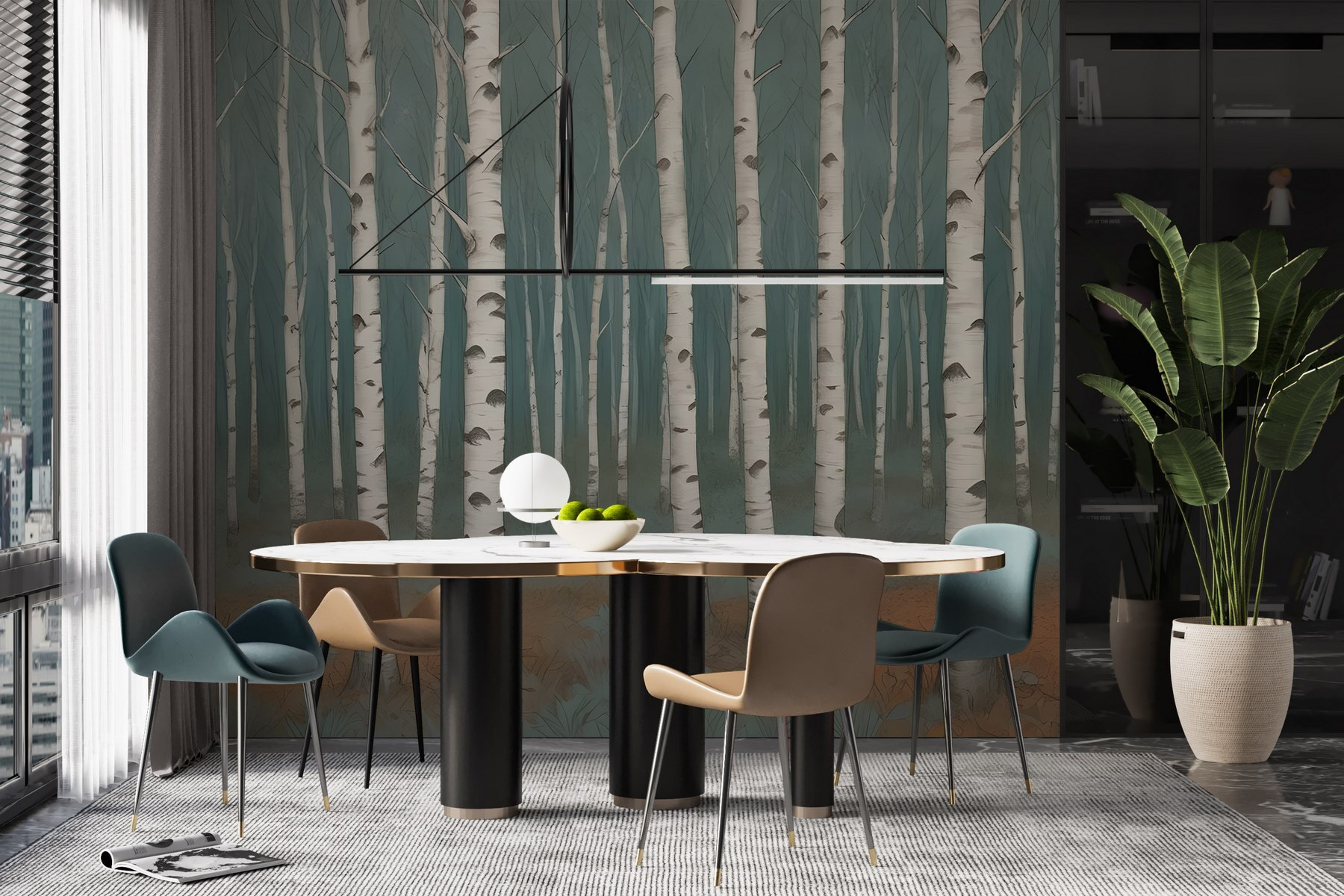 Stap in een sereen bos telkens als je een blik werpt op deze prachtige muurschildering. Met een bosje elegante berkenbomen brengt het de vredige sfeer van de natuur bij je thuis. Stel je voor dat je lekker wegkruipt met een goed boek en het gevoel hebt dat je je in een knusse bosrijke omgeving bevindt. De zachte kleuren creëren een rustgevende sfeer, perfect voor het transformeren van elke ruimte – van een woonkamer tot een meditatiehoekje.